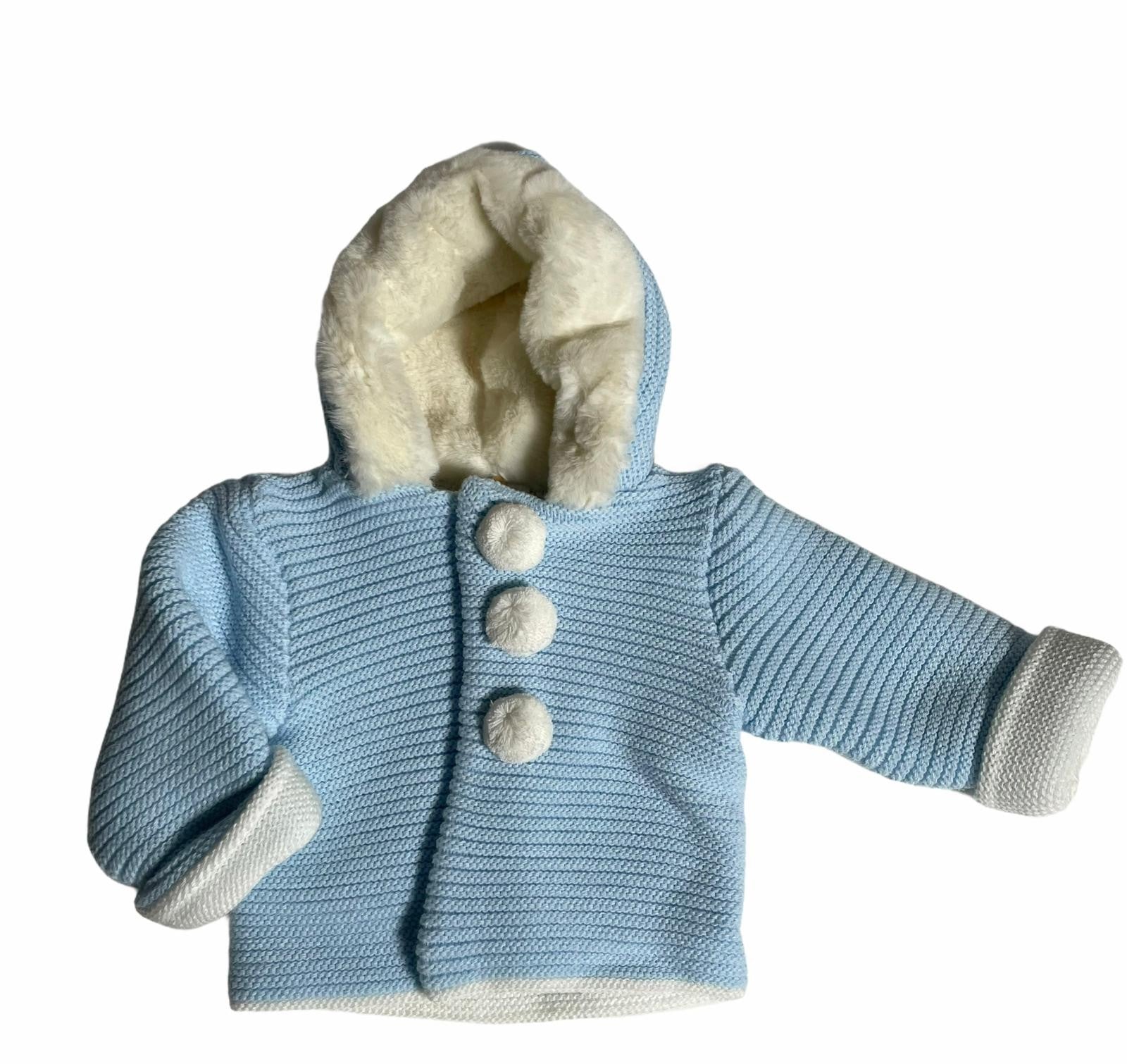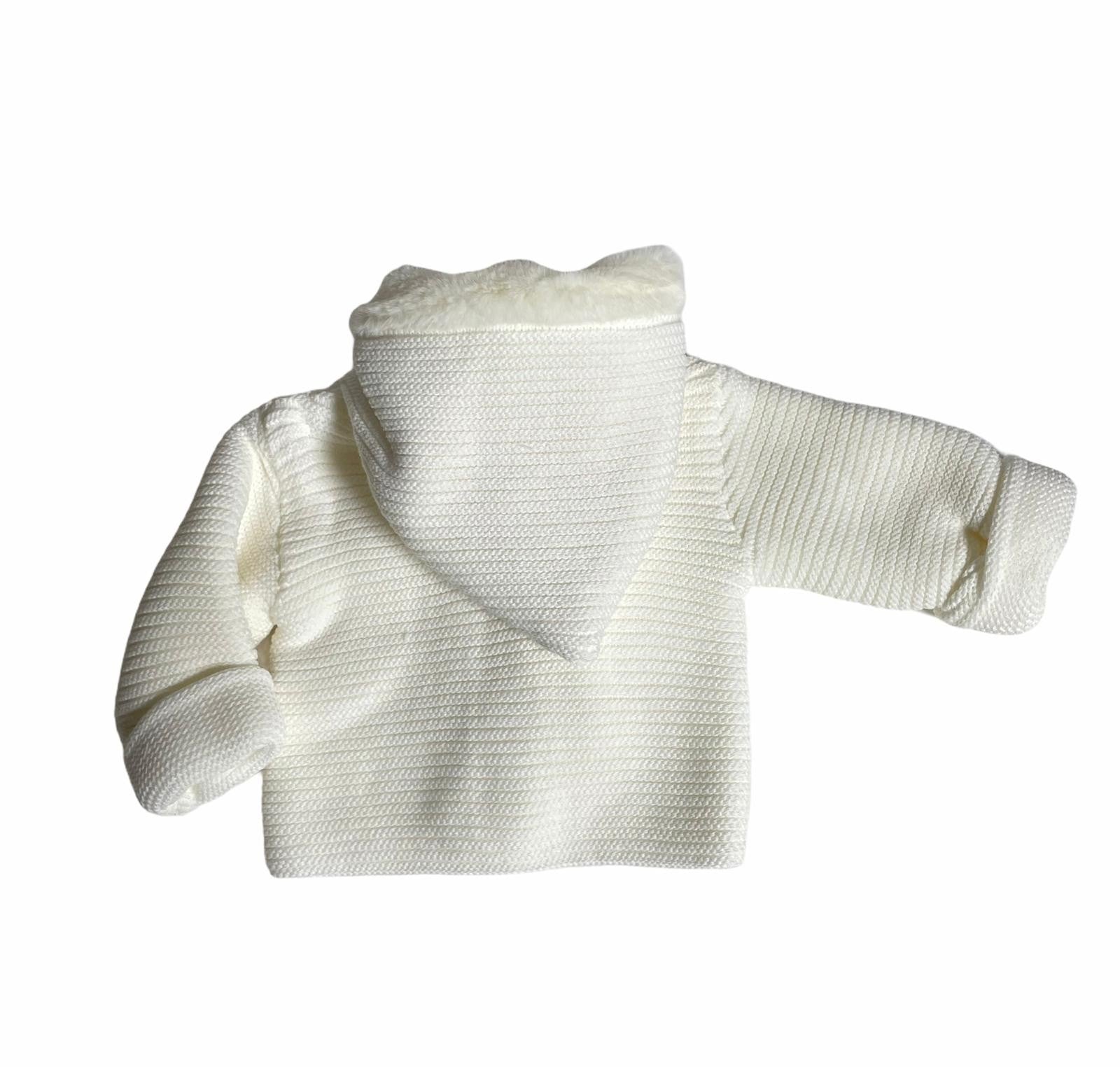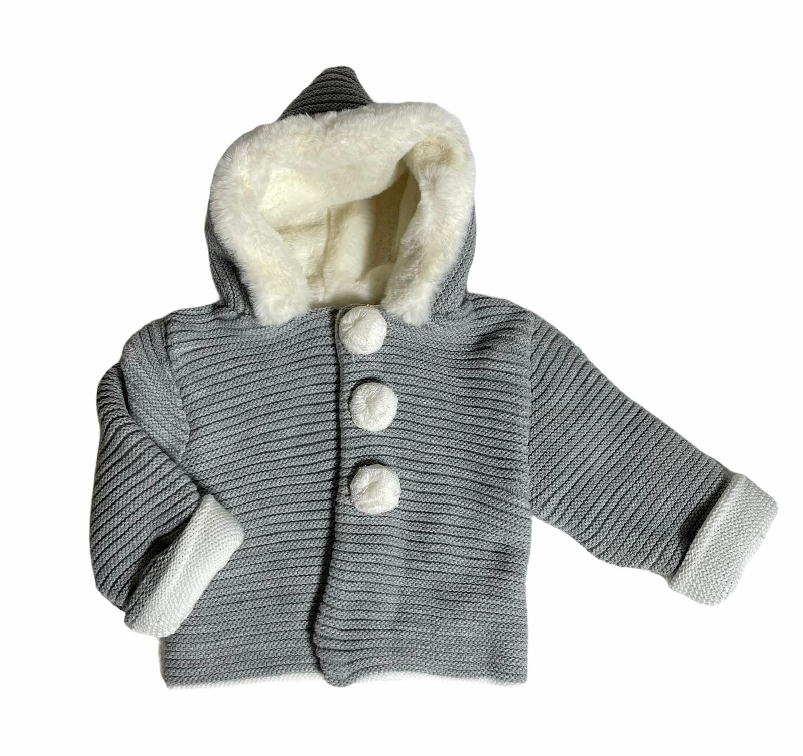 Caldo, morbido ed elegante cappottino in caldo cotone acrilico con cappuccio foderato in ecopelliccia, 3 bottoni a scomparsa ricoperti da un ponpon in lana.