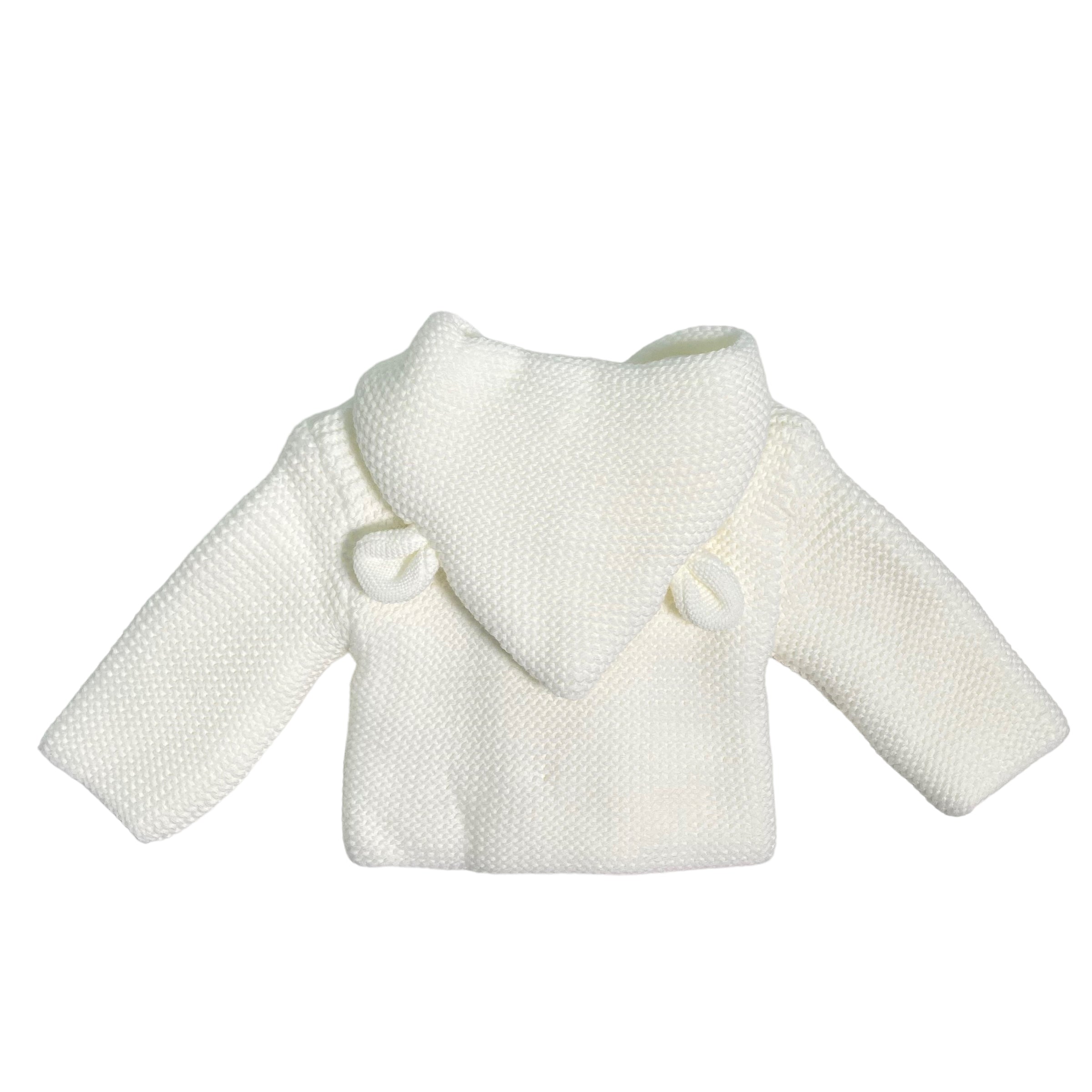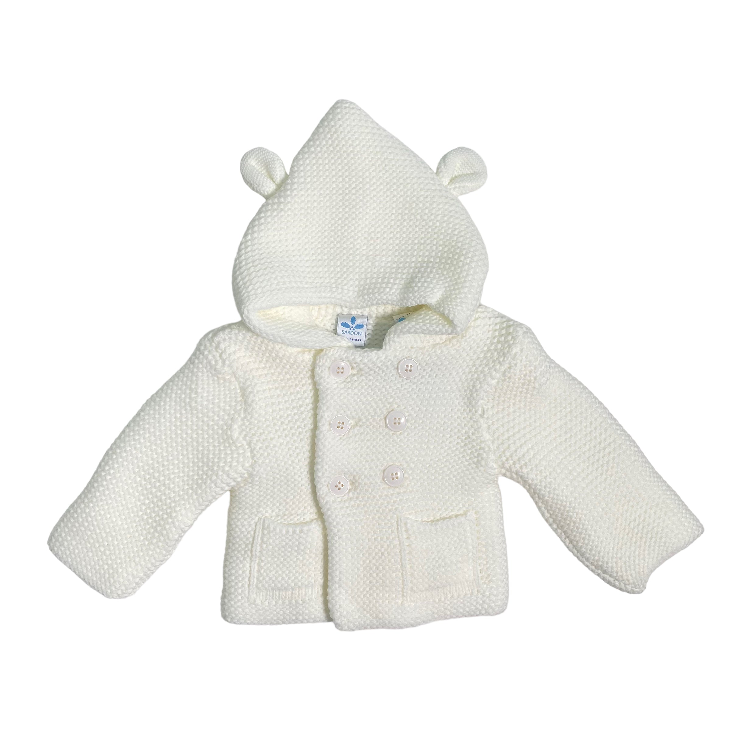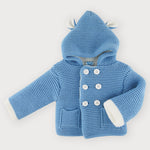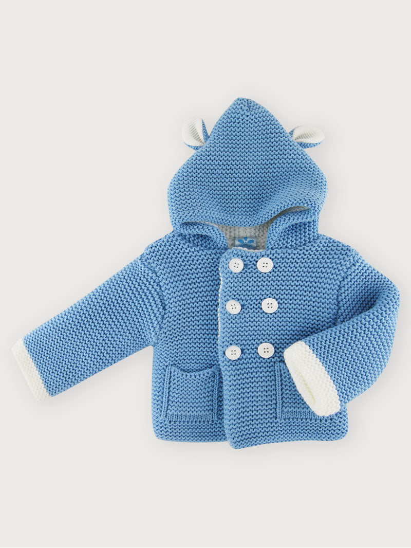 Cappotto doppiato in tessuto anallergico acrilico, con cappuccio con orecchiette.