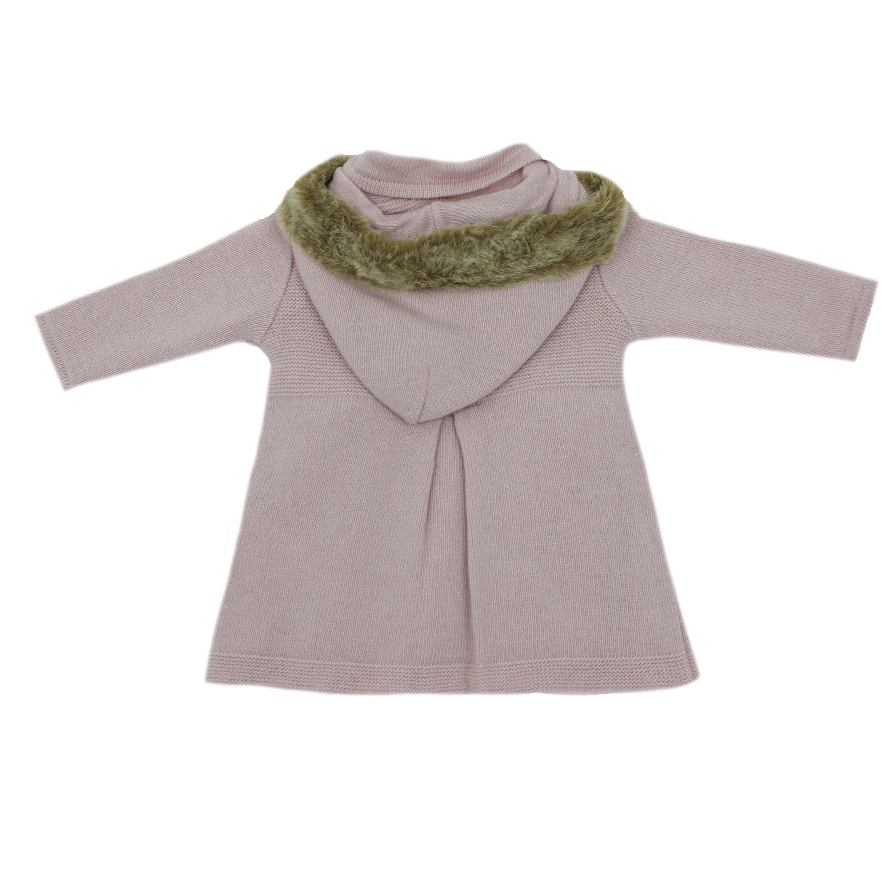 Cappotto in caldo cotone con cappuccio, colletto e pellicciotto, chiusura anteriore con bottoni e pompon ai lati.