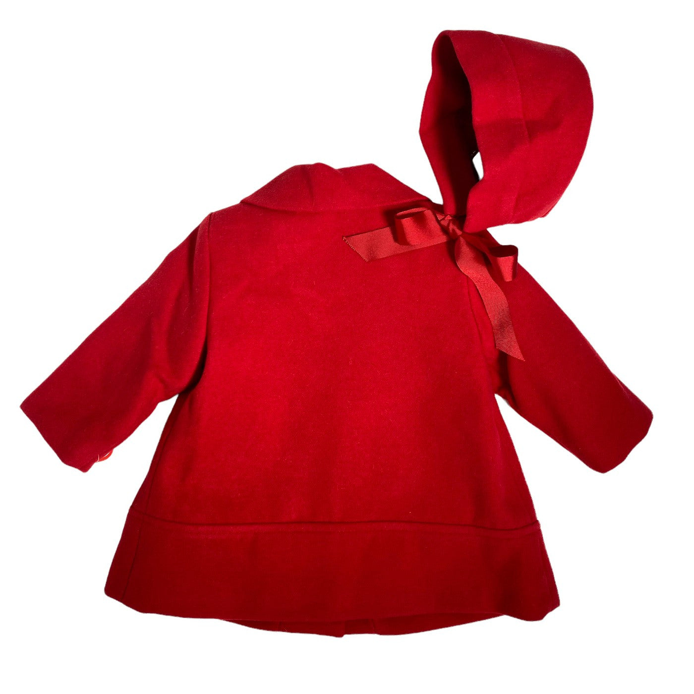Cappotto svasato in panno con colletto tondo e cuffia abbinata.