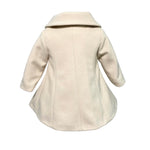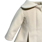 Cappotto svasato in panno, con collo tondo, e chiusura con bottoni.
