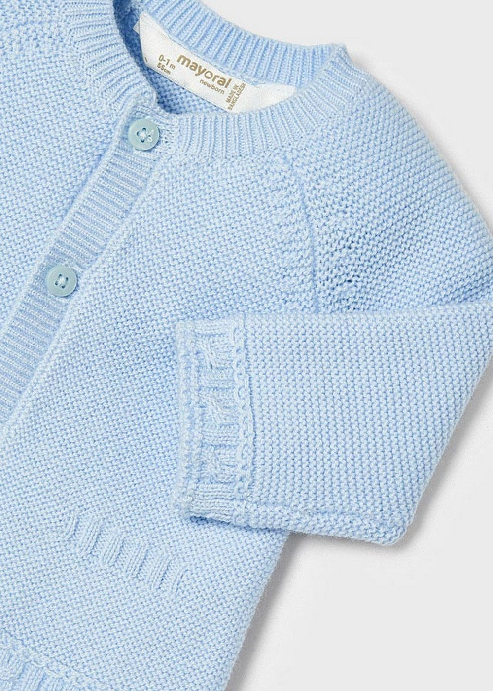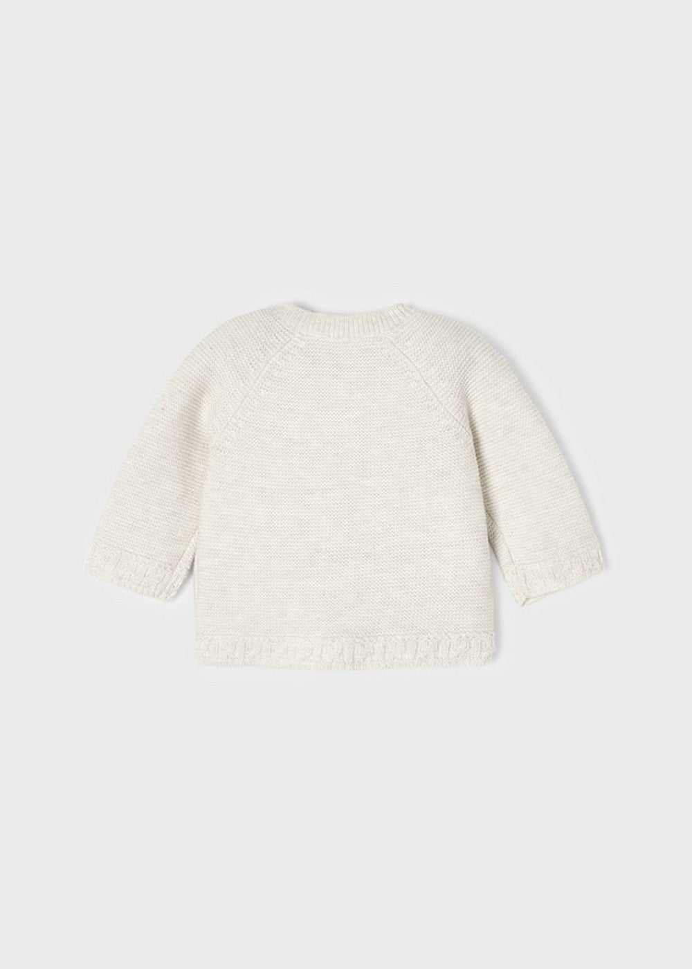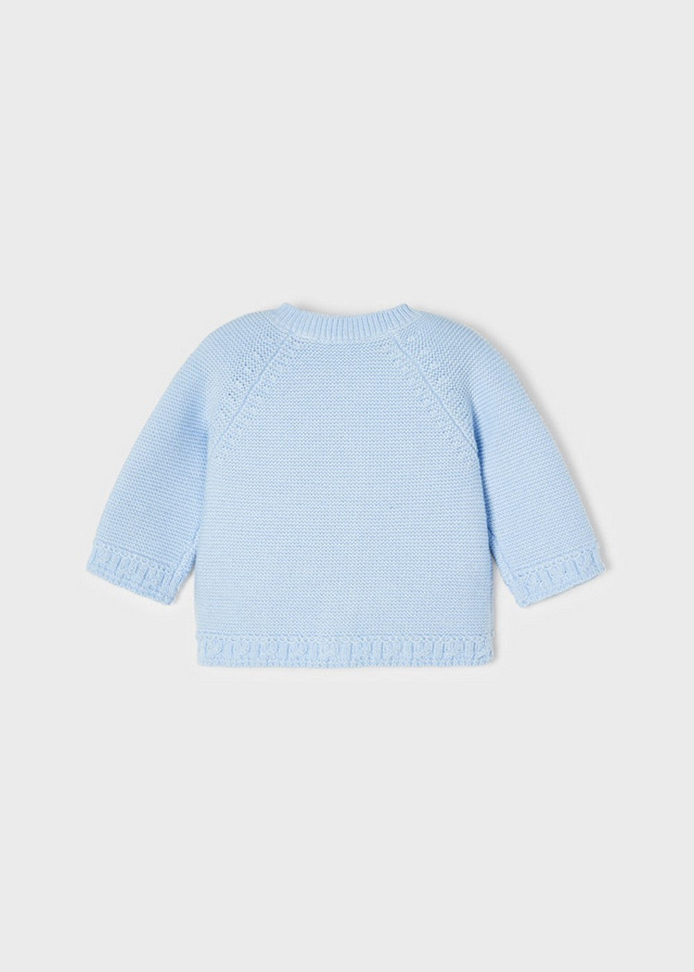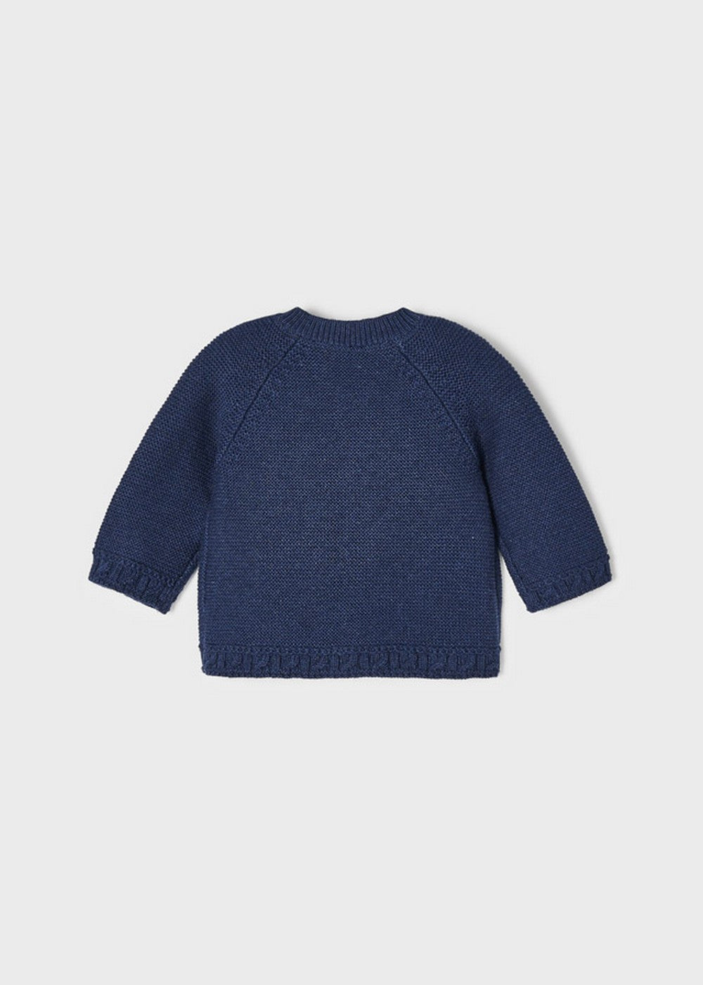 Giacca modello cardigan manica lunga per neonato. Girocollo. Chiusura con bottoni nella parte anteriore. Tessuto in tricot morbido al tatto. Finte tasche anteriori decorative.