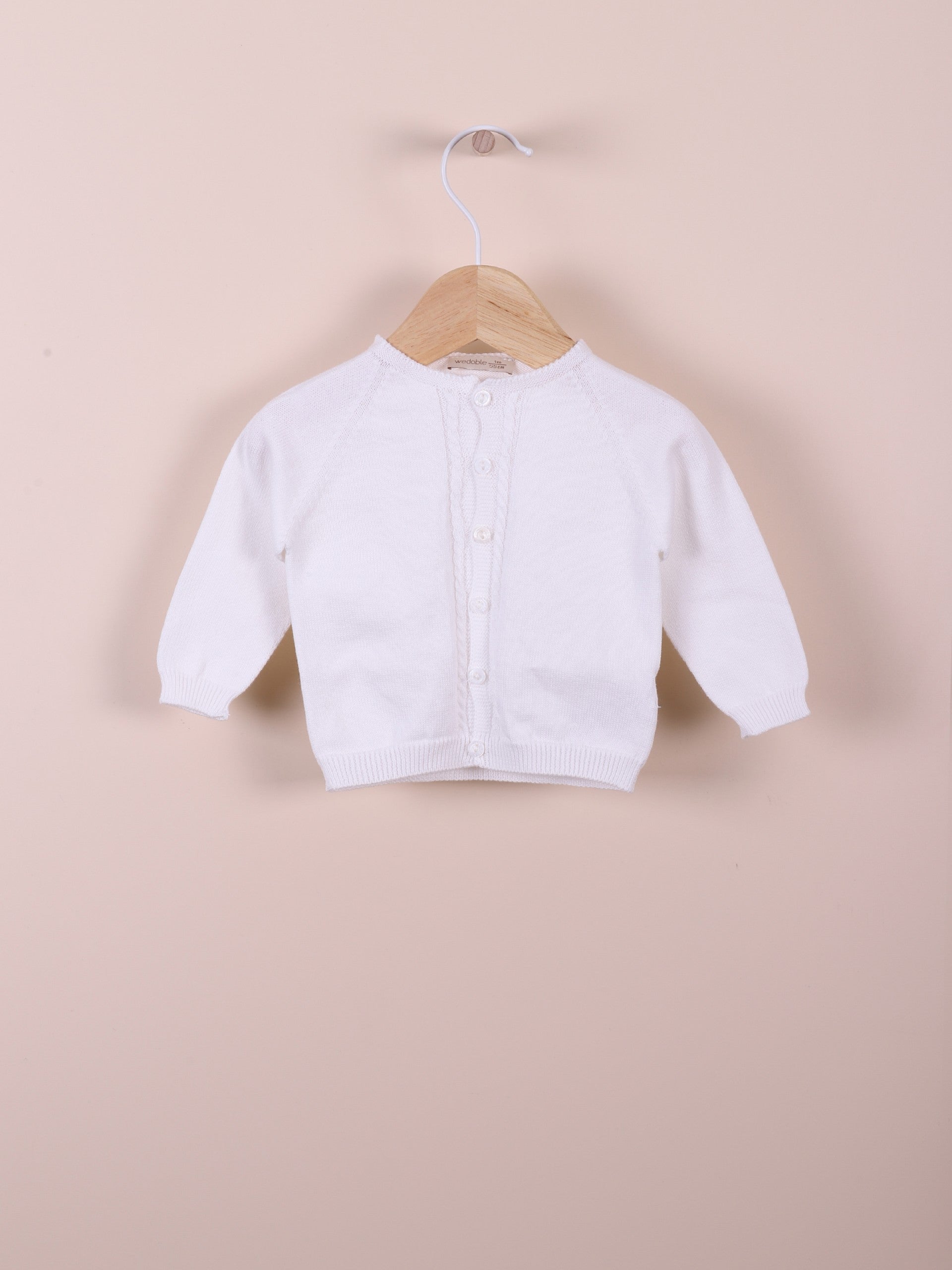 il nostro Cardigan in Filo Bianco WEDOBLE V2409308D, realizzato con cotone organico per un prodotto ecologico e delicato sulla pelle. La manica lunga e la chiusura con bottoni in madre perla assicurano calore e comfort al tuo piccolo. La lavorazione in treccia lo rende un capo elegante e di alta qualità.