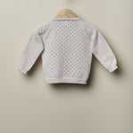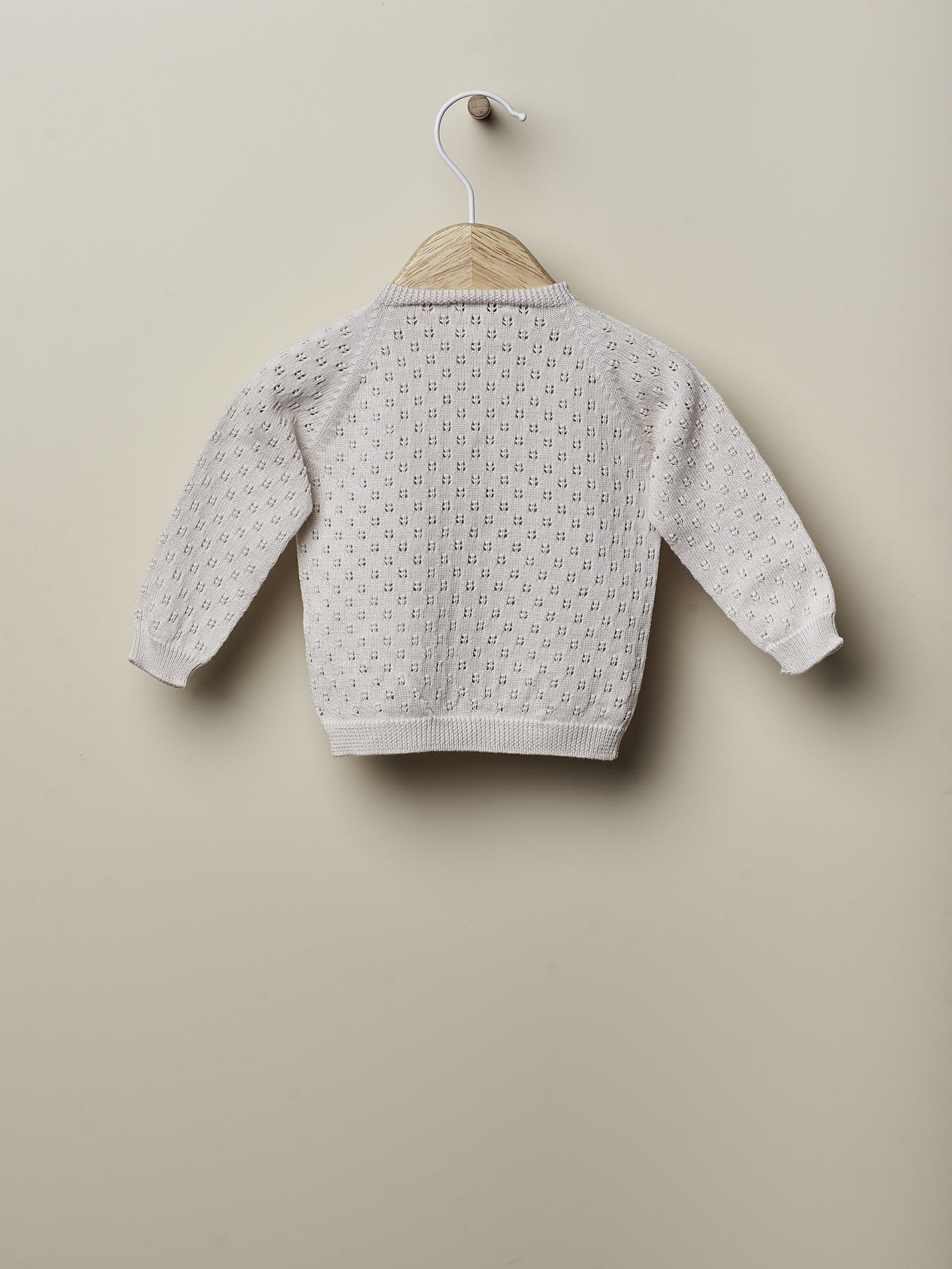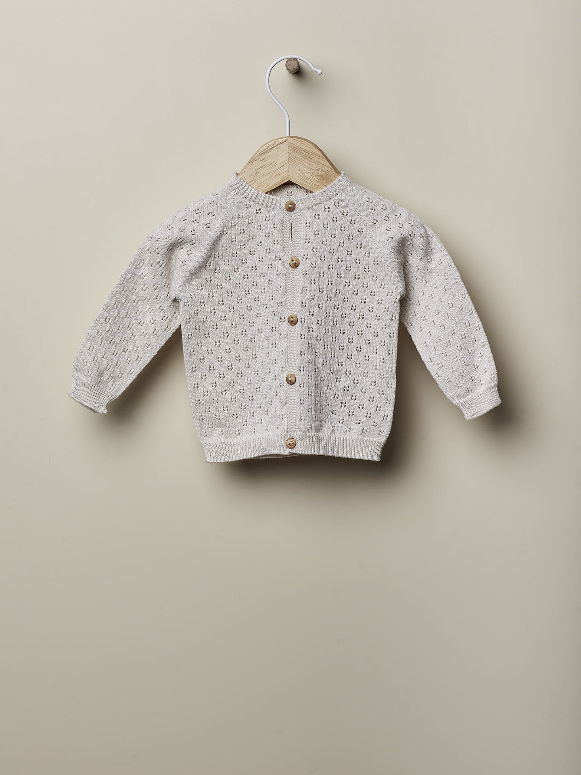 Il cardigan in filo neonato/a WEDOBLE V2405308A è realizzato in cotone organico e presenta una lavorazione traforata, ideale per una maggiore traspirabilità e comfort per il tuo bambino/a. L'ampio girocollo e la chiusura con bottoni in legno lo rendono perfetto per i mesi più freschi.