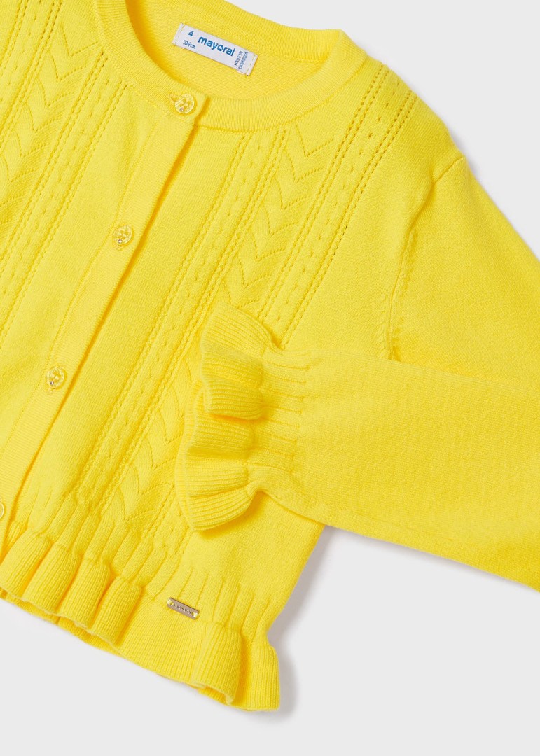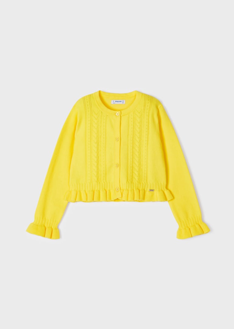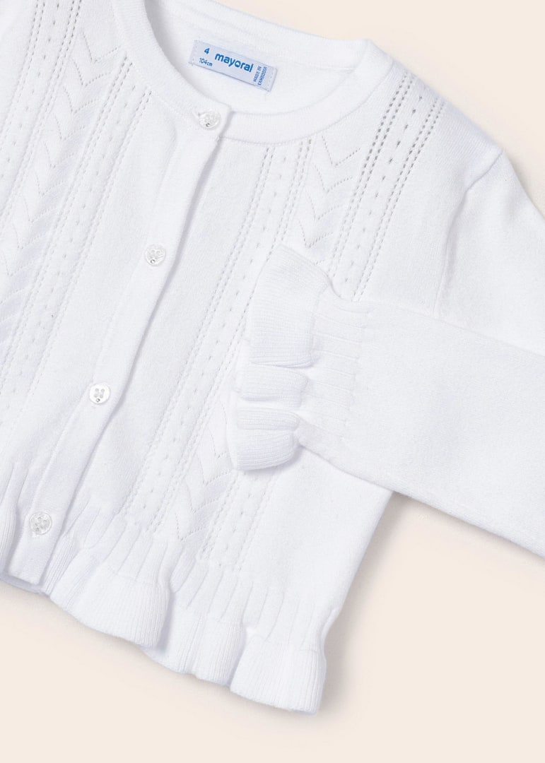 Capo ECOFRIENDS contiene cotone organico. Cardigan manica lunga per bambina con volant sul bordo della manica. Girocollo. Chiusura con bottoni nella parte anteriore. Tessuto in tricot morbido al tatto.