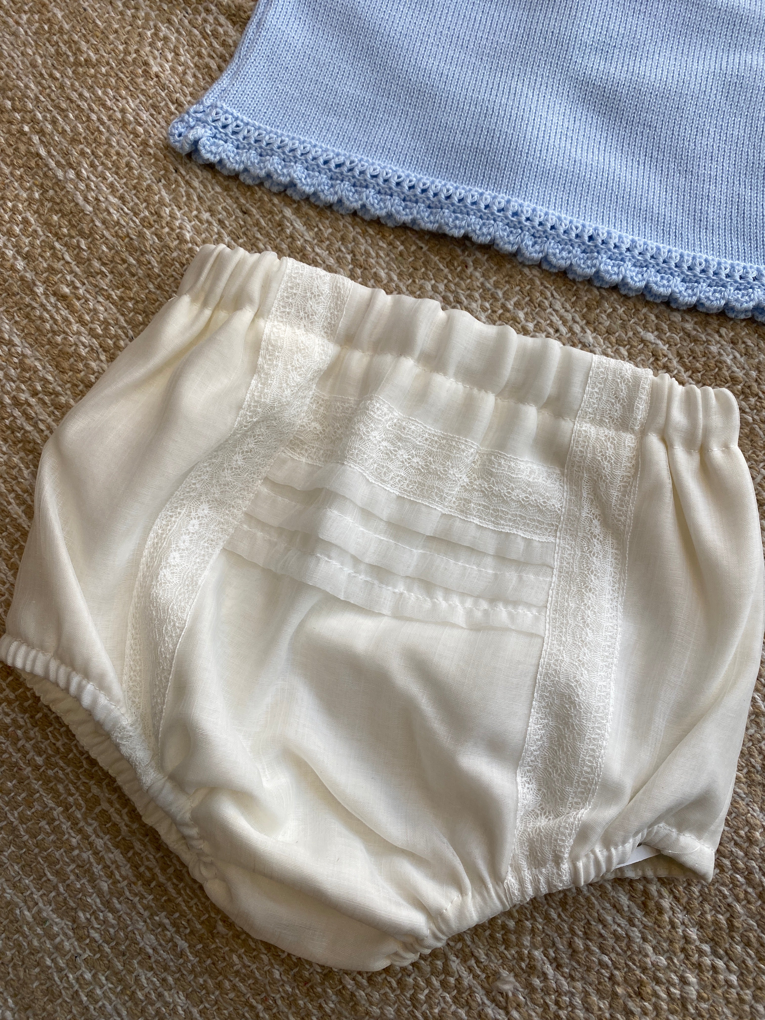 La culotte è in cotone color panna impreziosito con il pizzo e arricciato sulle gambe.