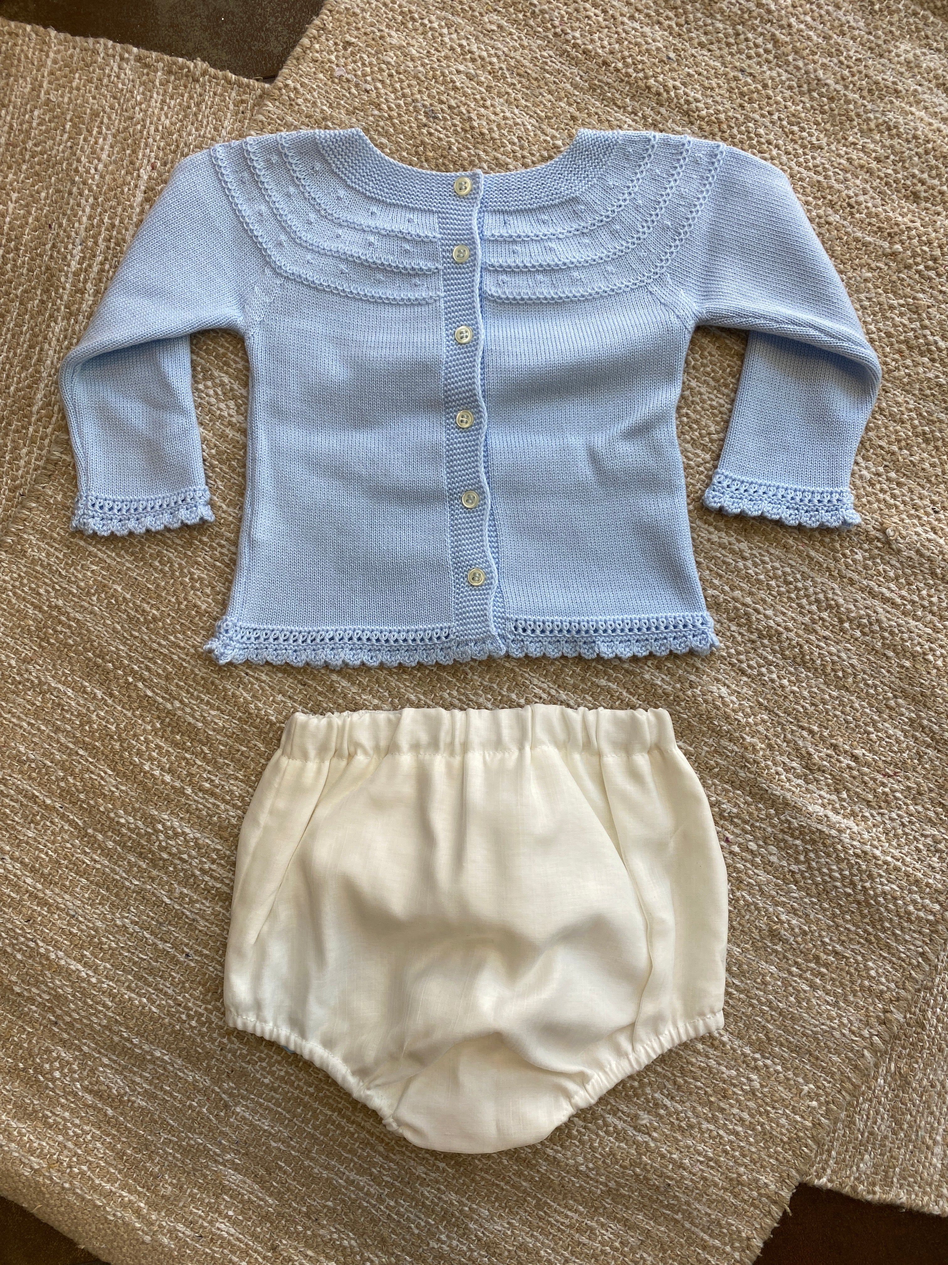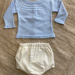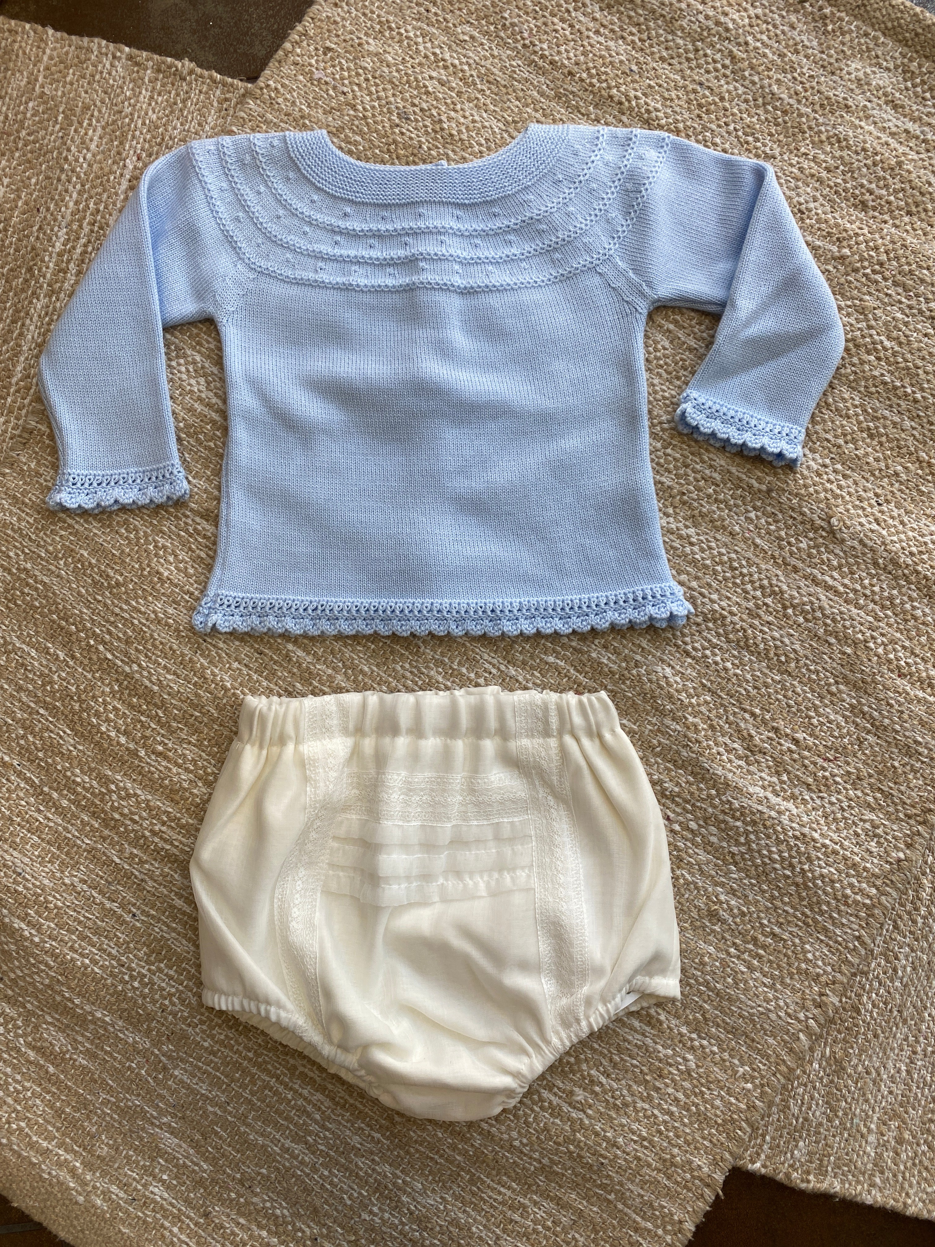 Completino con Manica lunga con la parte superiore in filo color celeste. Presenta ricami sulla parte del colletto e pizzo sui bordi delle maniche e della maglietta.