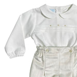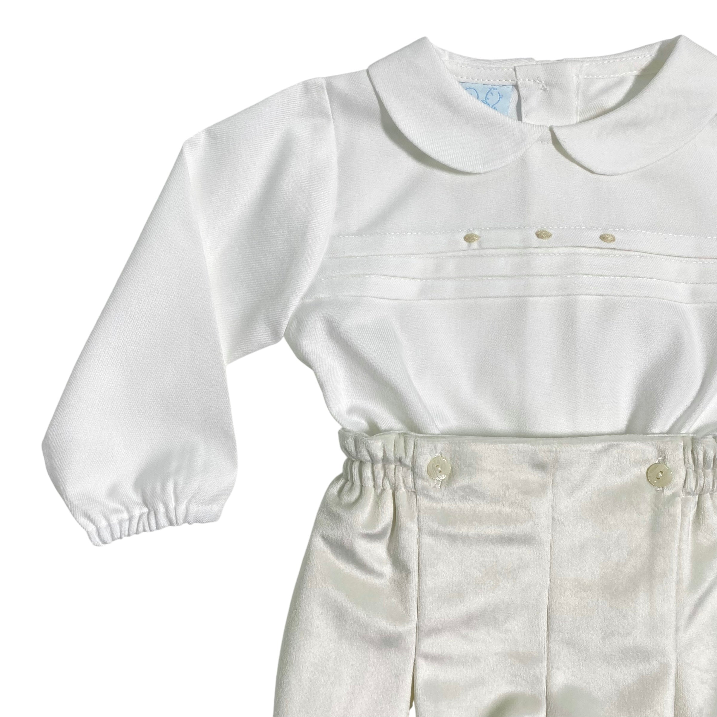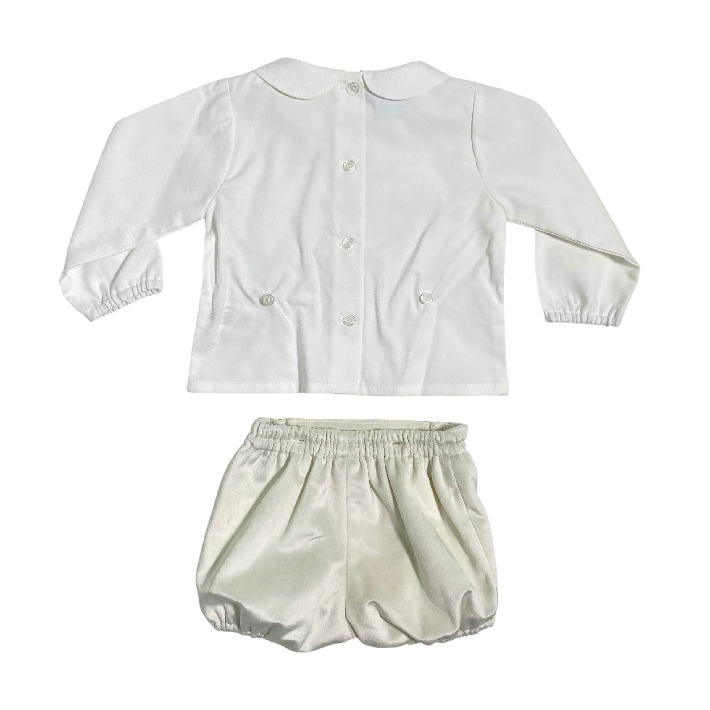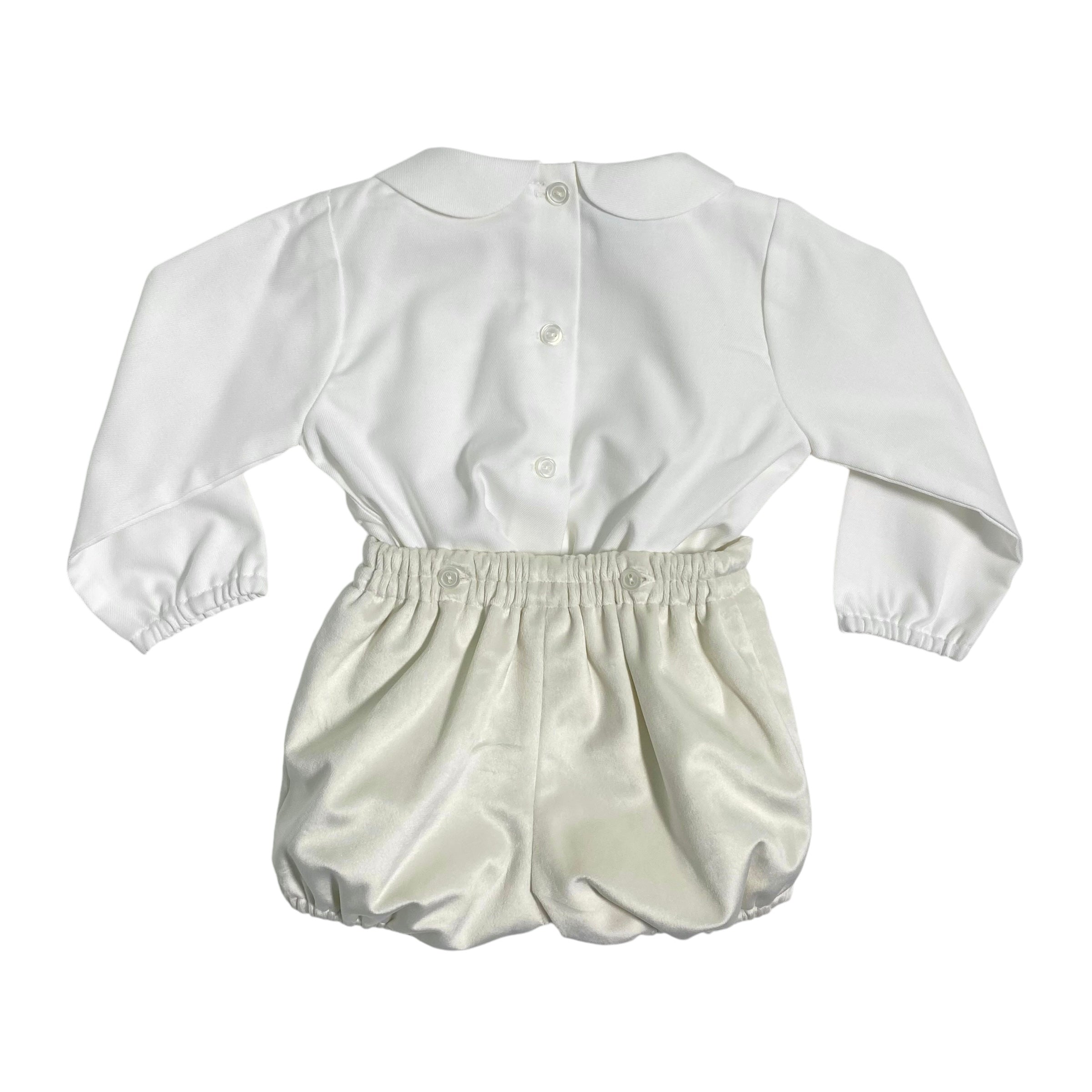 -Camicia manica lunga (panna) in caldo cotone con colletto tondo, elastico ai polsini ,pieghe sul davanti con ricamo in contrasto beige ,chiusura sul retro con bottoni.