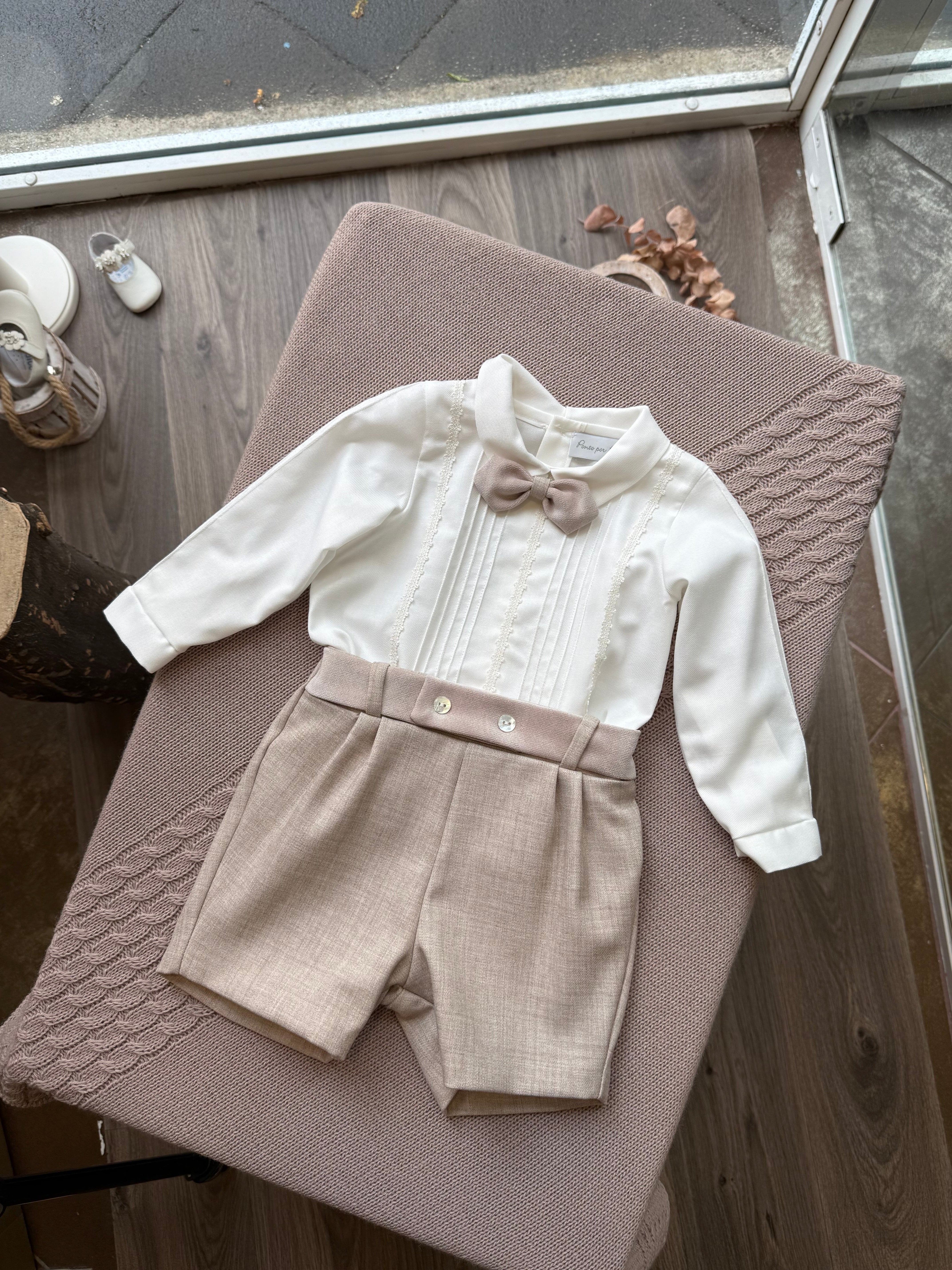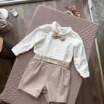Completo cerimonia maschile elegante, composto da camicia a manica lunga in morbido cotone arricchita da un inserti di pizzo, bermuda corti in tessuto impreziosito da bottoni sulla fascia, e papillon realizzato nel medesimo tessuto dei bermuda. Camicia e bermuda sono uniti internamente tramite bottoncini per creare un pagliaccetto dallo stile raffinato.