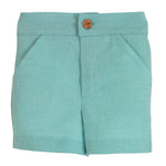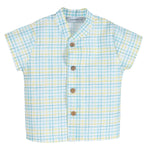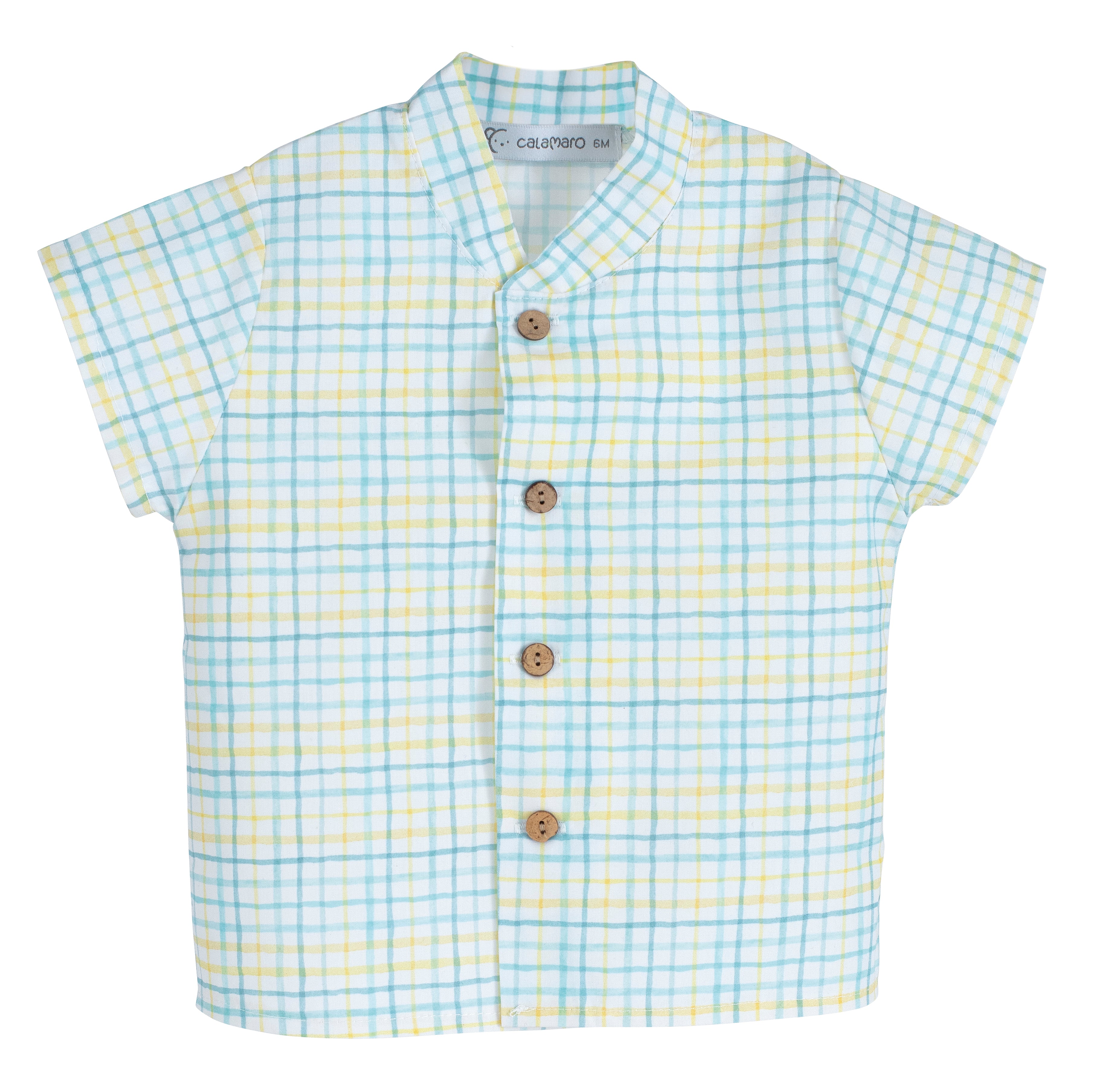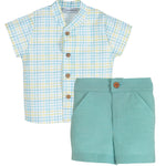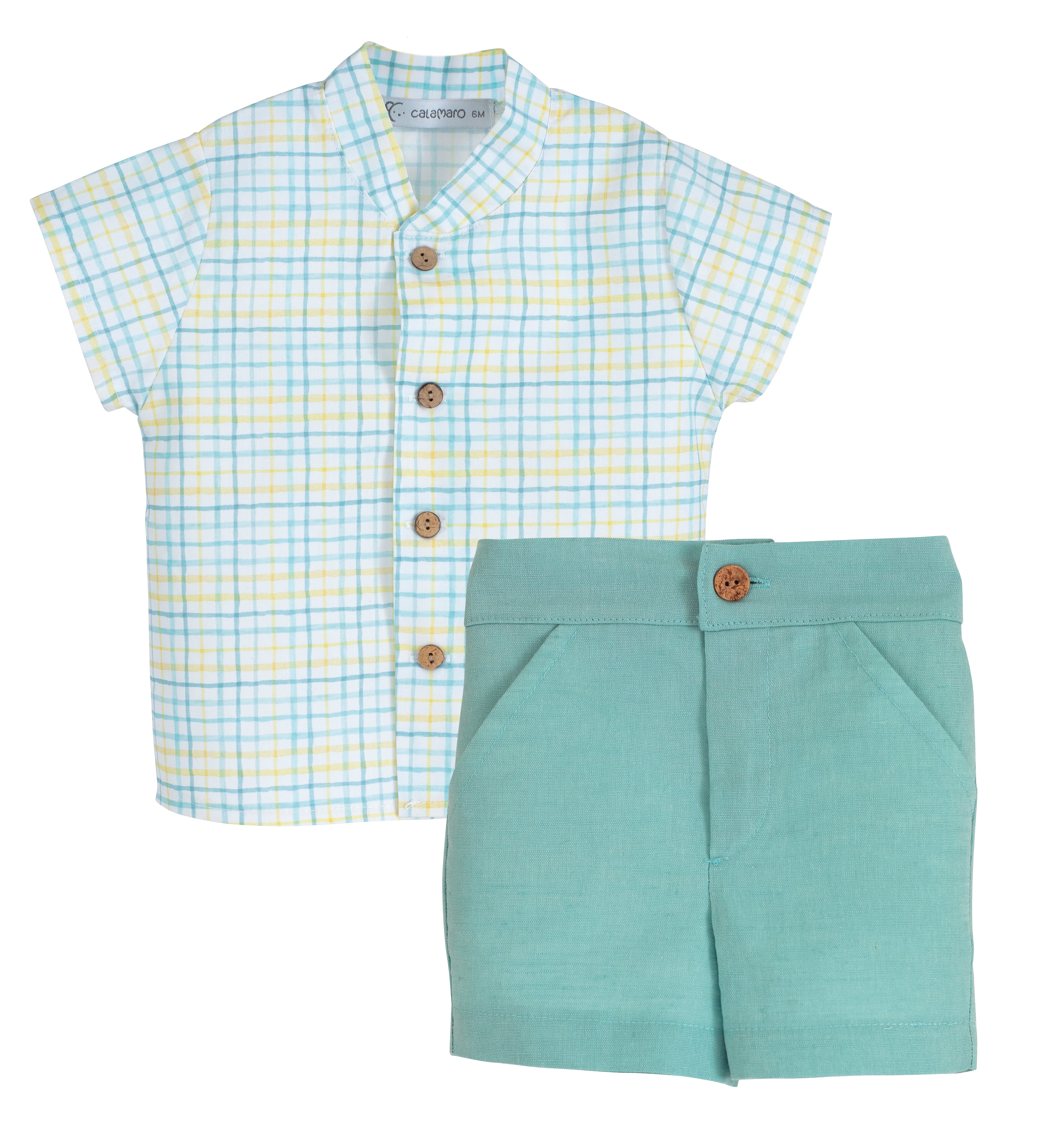 Questo completo in cotone per bambini è composto da un bermuda di colore verde acqua e una camicia a fantasia quadri multicolore con colletto coreano. Garantisce comfort e stile per il tuo bambino. Vestibilità perfetta per ogni occasione.