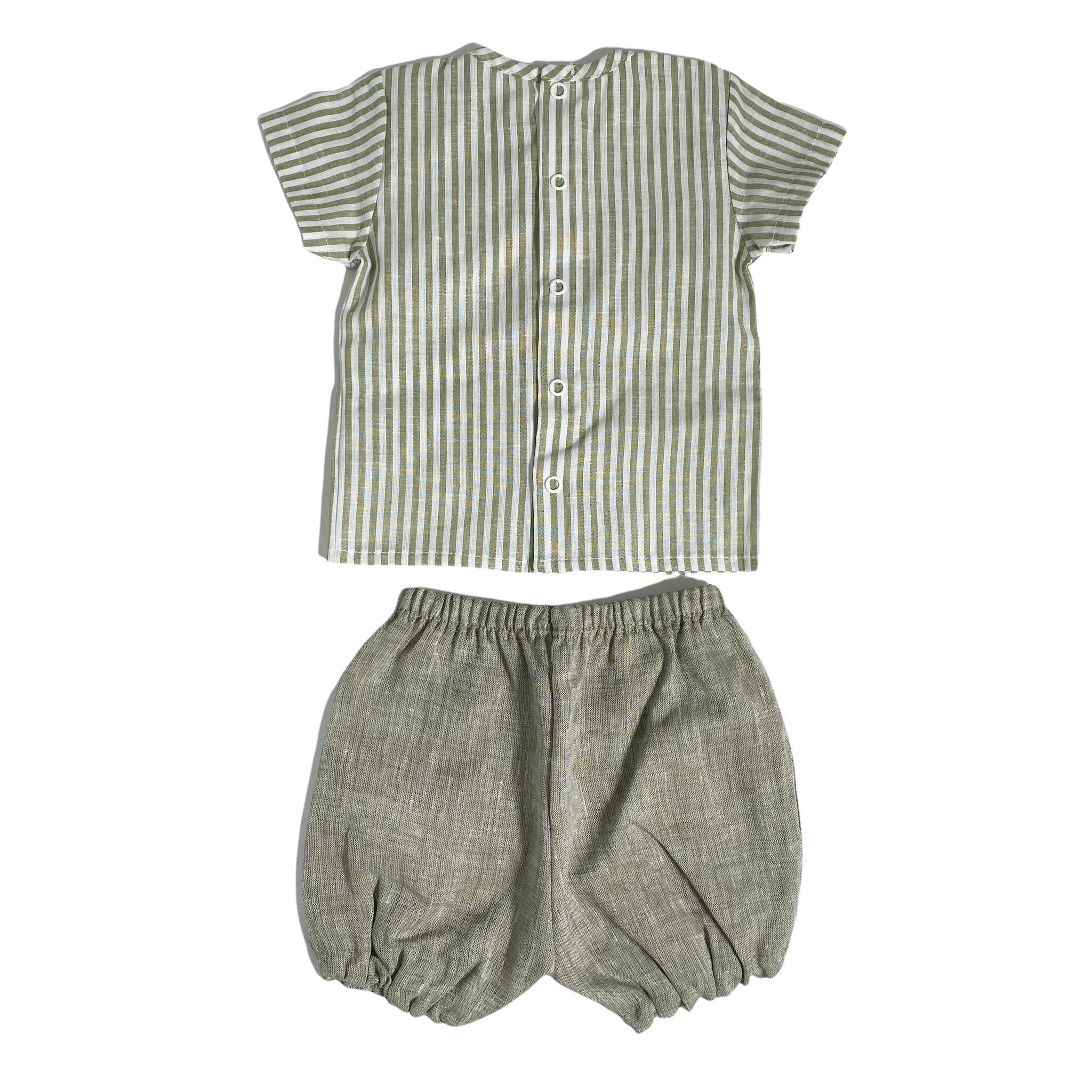 Completo in lino 100% composto da bermuda in tinta unita verde e camicia a righe con abbottonatura sul retro con bottoni a pressione.