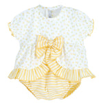Questo completo è perfetto per la tua neonata! Realizzato in morbido cotone, la maglia a mezza manica con fantasia di mele e dettagli a righe si apre sul davanti con un grazioso fiocco. La culotte a righe completa il look, garantendo comfort e stile per la tua piccola.