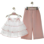 Questo completo bambina è perfetto per ogni occasione, sia elegante che casual. Il pantalone palazzo è confortevole e stiloso, mentre il top in cotone a balze con fiocchi sulle spalle aggiunge un tocco di originalità. Ideale per ogni età!