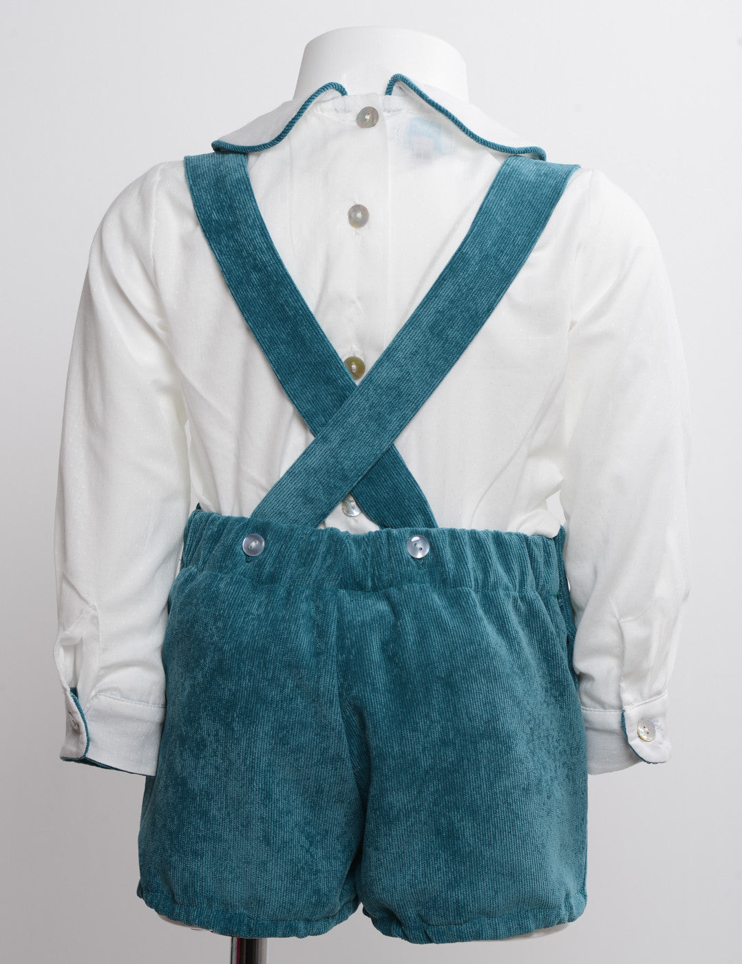Completo con salopette in velluto con bretelle ed elastico alla vita e camicia maniche lunghe con colletto e chiusura posteriore.