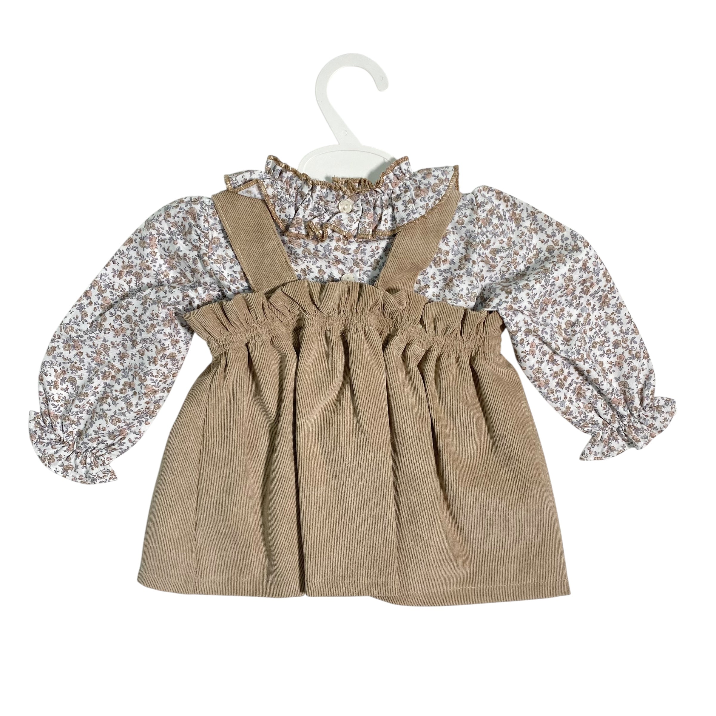 Questo completo neonata unisce eleganza e comfort in un duo perfetto: la salopette in velluto millerighe dona morbidezza e calore, mentre la camicia stampata floreale con collo rouches aggiunge un tocco raffinato e delicato. Ideale per occasioni speciali, garantisce libertà di movimento e stile impeccabile. Un outfit curato nei dettagli, pensato per esaltare la dolcezza naturale della tua piccola.
