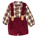 Questo completo elegante per neonato combina una salopette in velluto morbido e raffinato con una camicia scozzese dallo stile classico, perfetto per le festività natalizie. La salopette garantisce comfort e calore, mentre la camicia aggiunge un tocco tradizionale e sofisticato. Un outfit ideale per celebrare con stile e sicurezza i momenti speciali della stagione invernale.