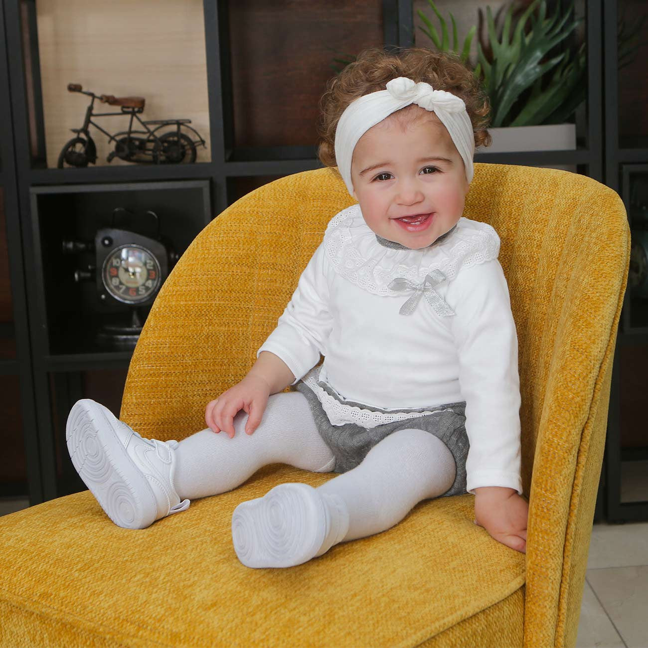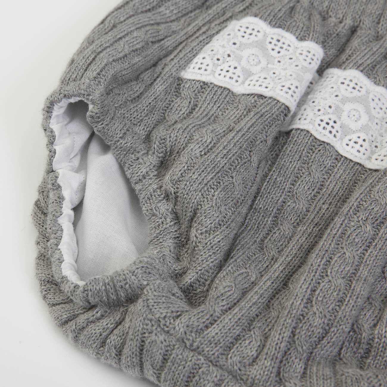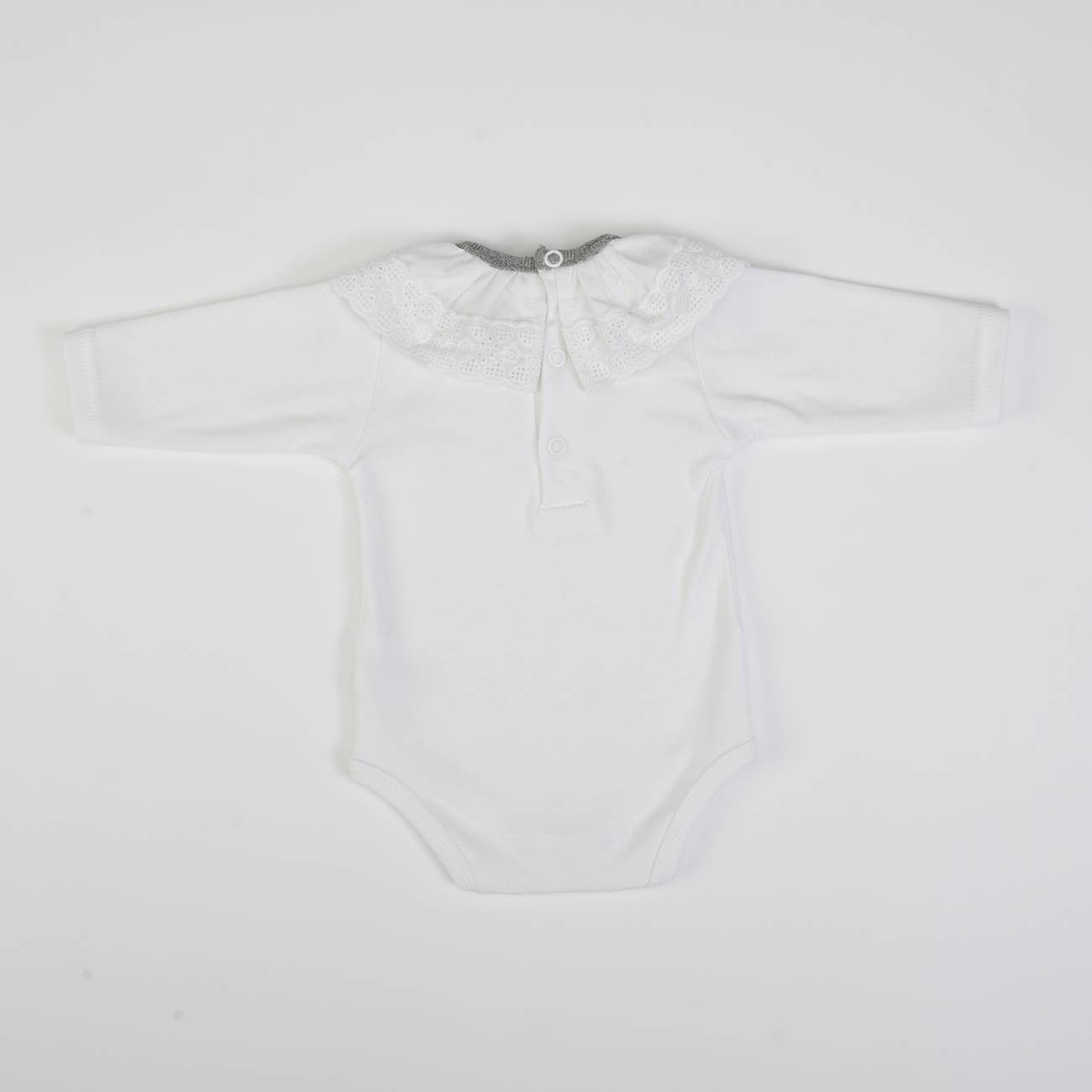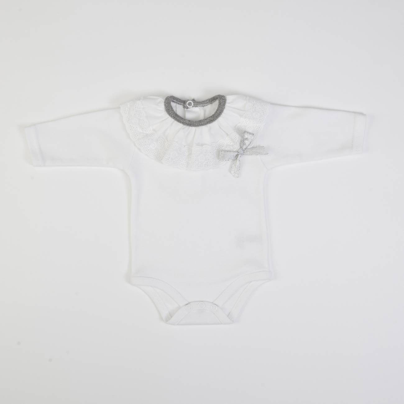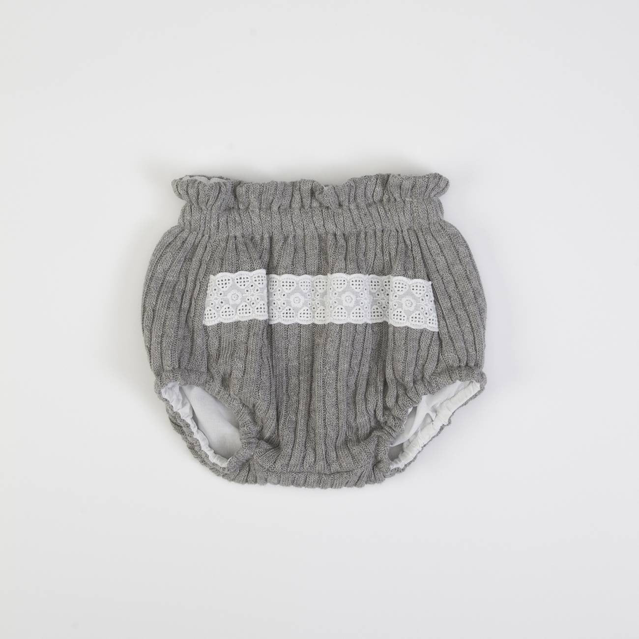 Completo composto da due pezzi con culotte in lana con elastico in vita e alle gambe con fascia in pizzo san gallo e body in caldo cotone con colletto in pizzo san gallo e bottoni al cavallo e sul retro con maniche lunghe.