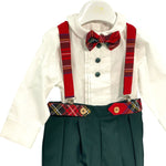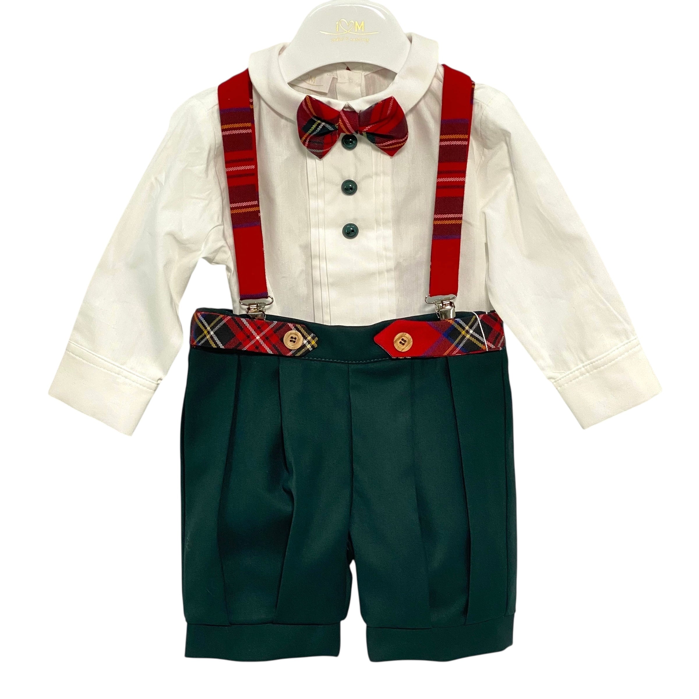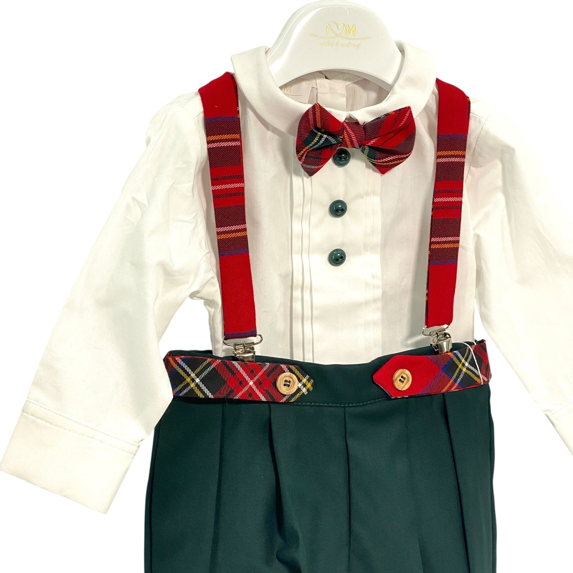 Questo completo elegante 3 pezzi è perfetto per le festività natalizie del tuo neonato. Realizzato in caldo cotone, include bermuda verde, camicia bianca con bottoncini verdi e bretelle con motivo scozzese, completato da un papillon coordinato. Un outfit raffinato che unisce comfort e stile, ideale per celebrare con classe i momenti speciali.