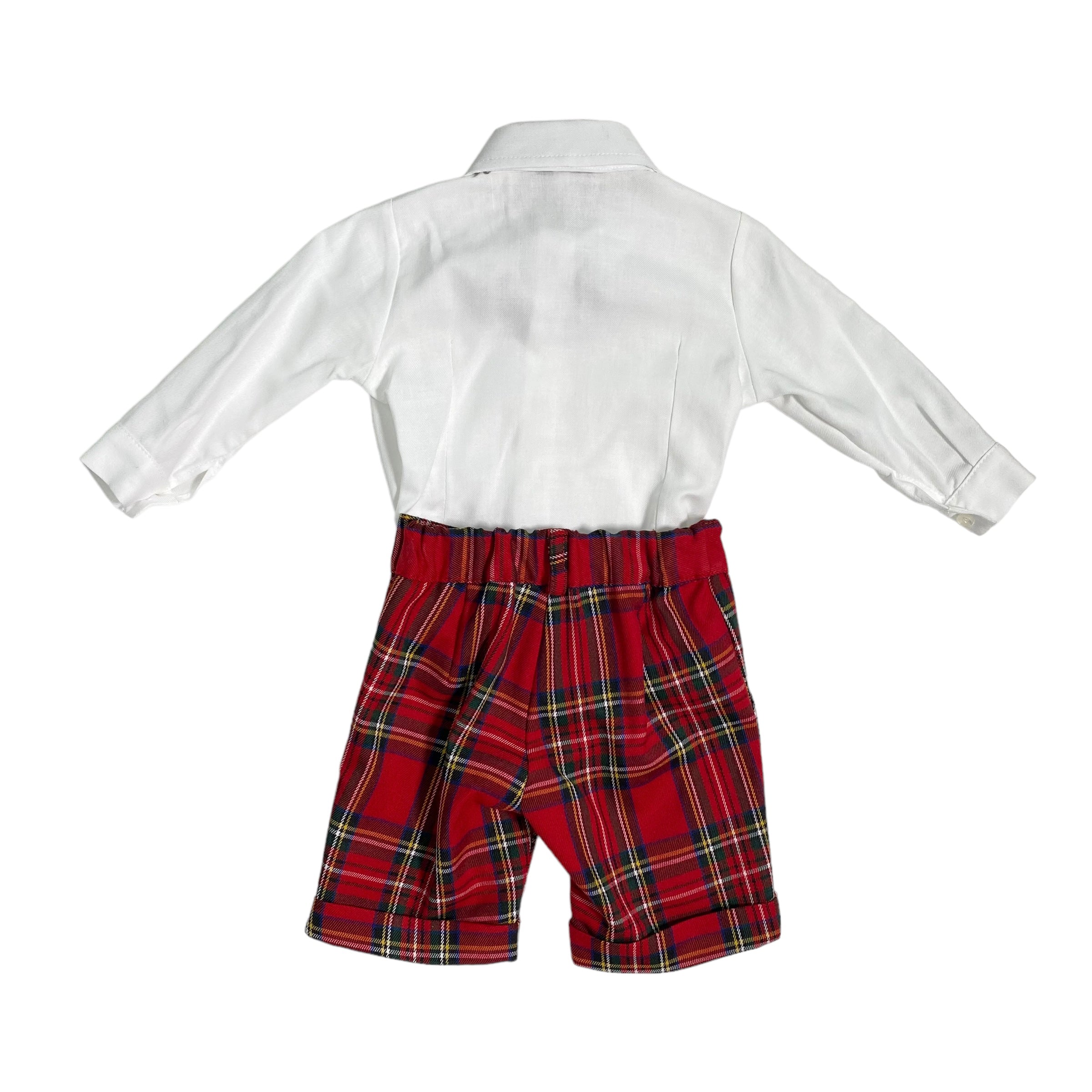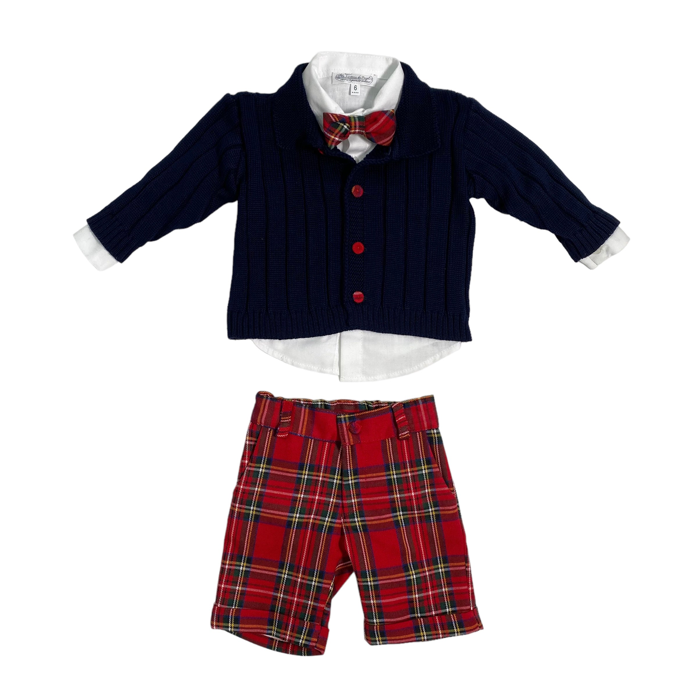 Completo elegante con bermuda con bretelle scozzese, camicia in caldo cotone panna, papillon scozzese dello stesso tessuto del pantalone e cardigan con colletto.