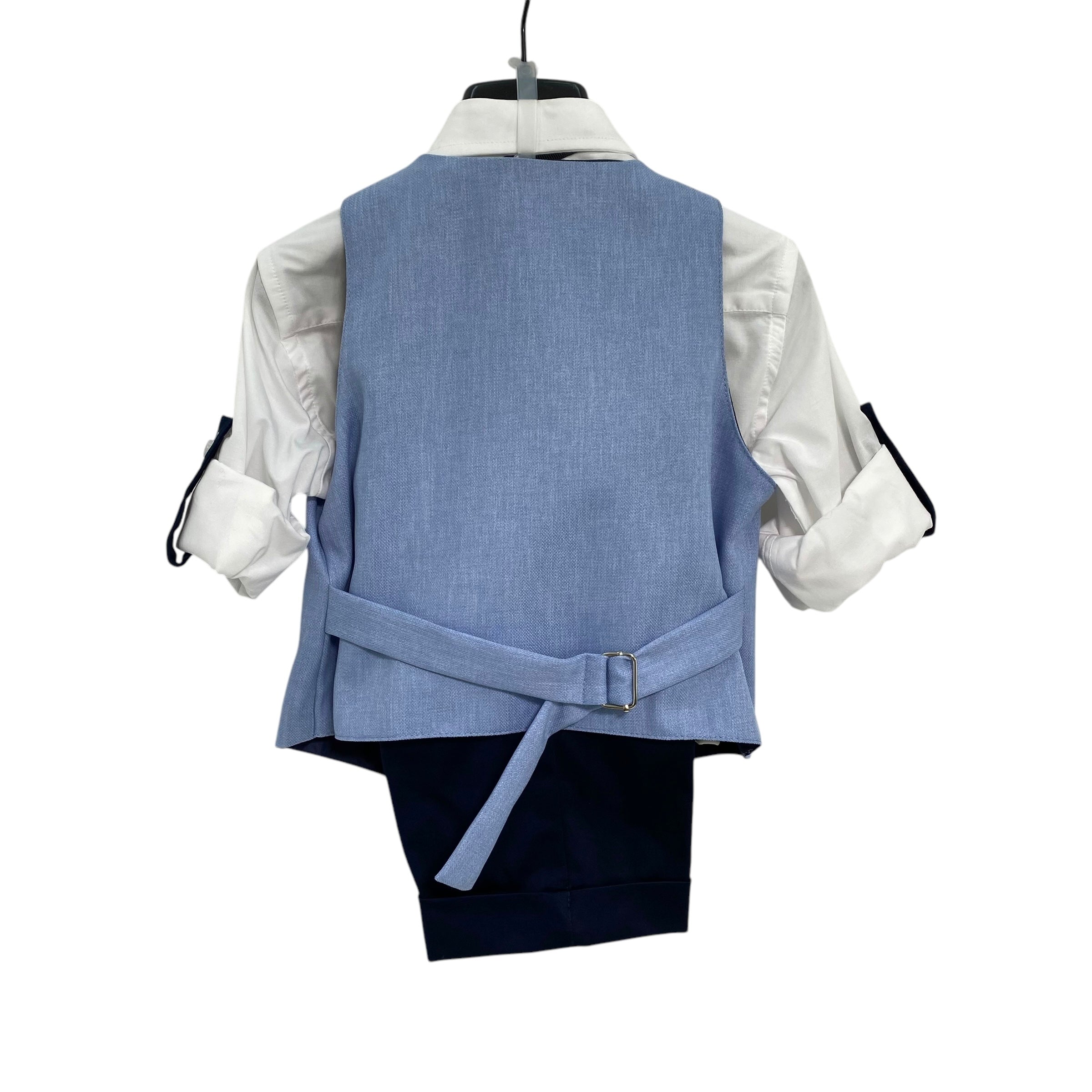 Questo completo elegante per paggetto è composto da bermuda con risvolto, camicia bianca, panciotto e papillon abbinato. Perfetto per far sentire il tuo bambino un piccolo signore il giorno del matrimonio. Con il suo stile raffinato e dettagli curati, garantirà un aspetto elegante e impeccabile.