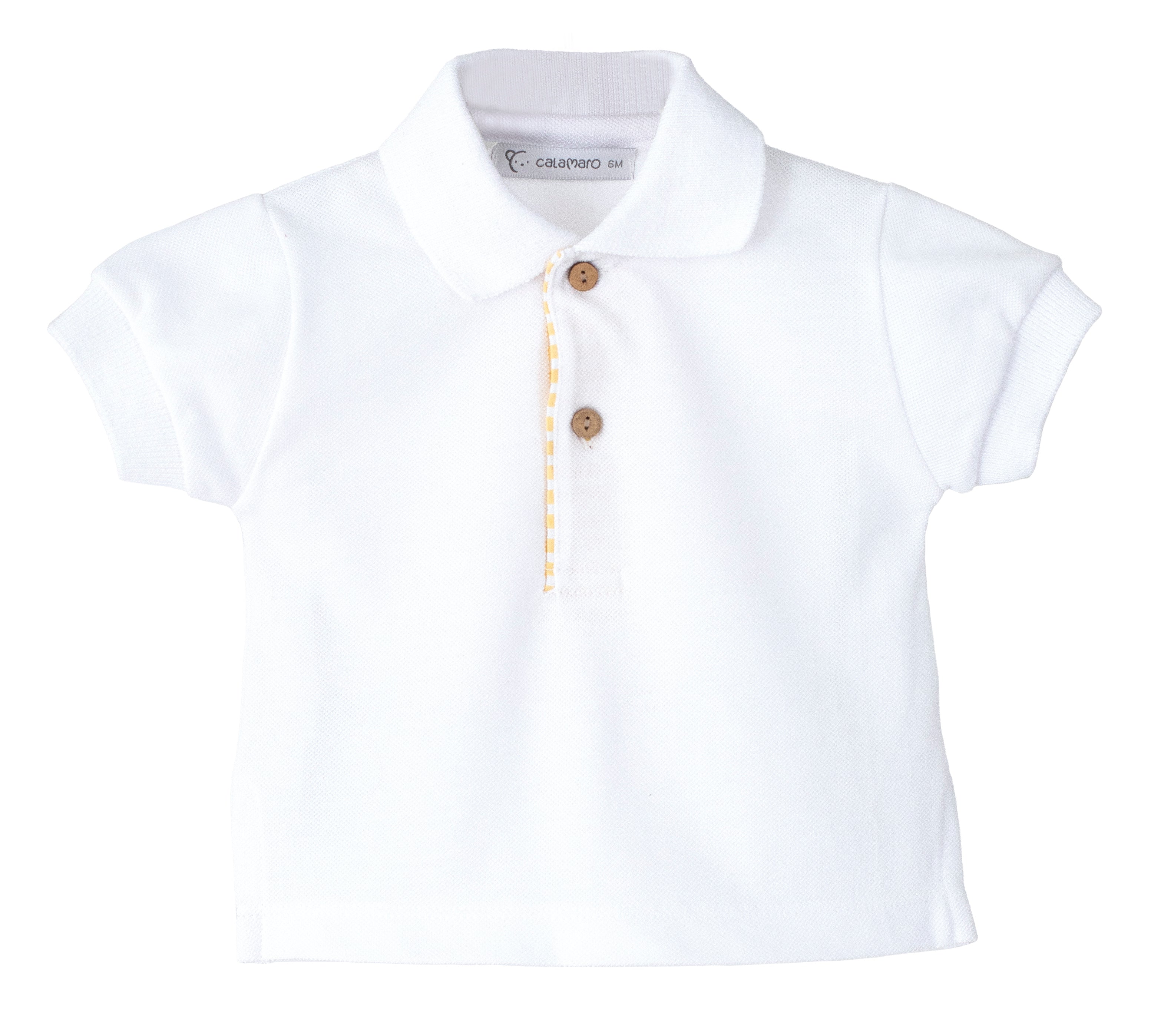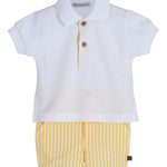 Risplendi nella primavera con questo completo in cotone giallo per neonati di CALAMARO 11111, polo in piquet bianca ha dettagli di bottoni in legno mentre il bermuda a righe gialle e bianche offre comodità con l'elastico sul retro e il bottone. Rivivi l'infanzia con questo completo fresco e versatile.