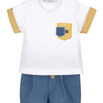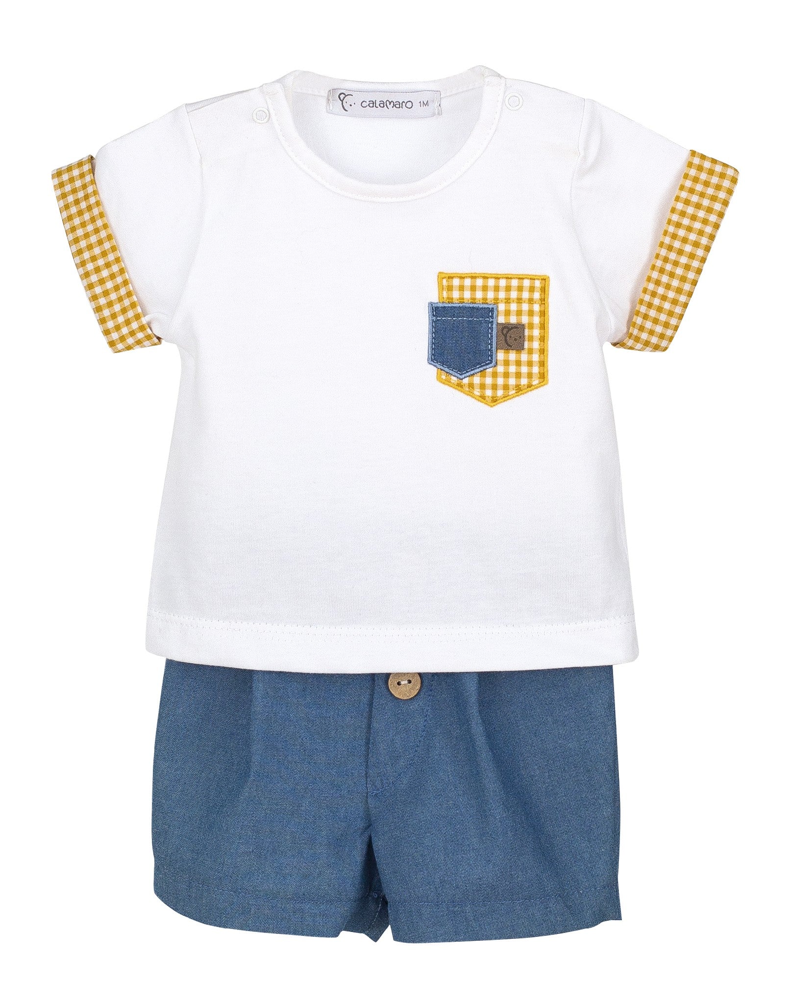 -maglia mezza manica con taschino in cotone tinta unita bianca con dettagli in vichy senape