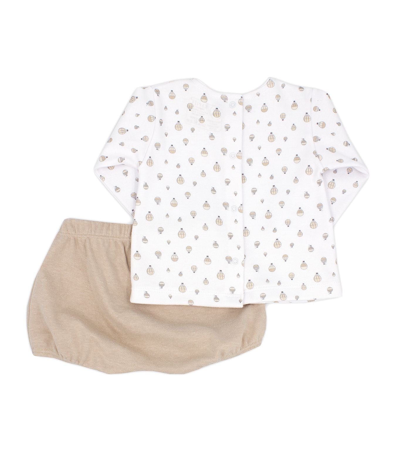 Completo 2 pezzi neonato in caldo cotone,tessuto molto morbido e pratico, composto da maglia girocollo tinta unita bianca con fantasia mongolfiere in contrasto beige apertura sul retro con bottoni a pressione ,bermuda tinta unica beige