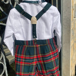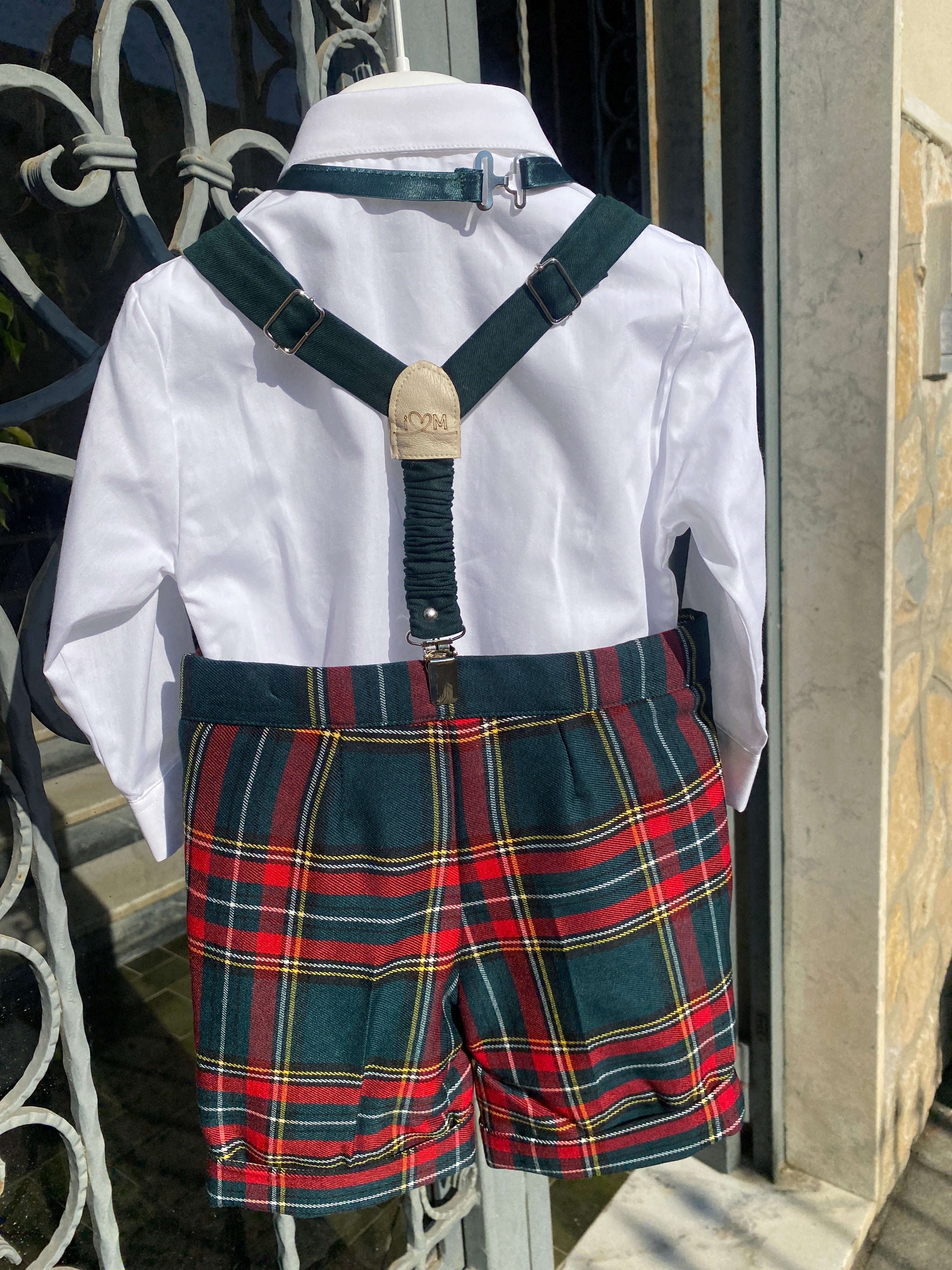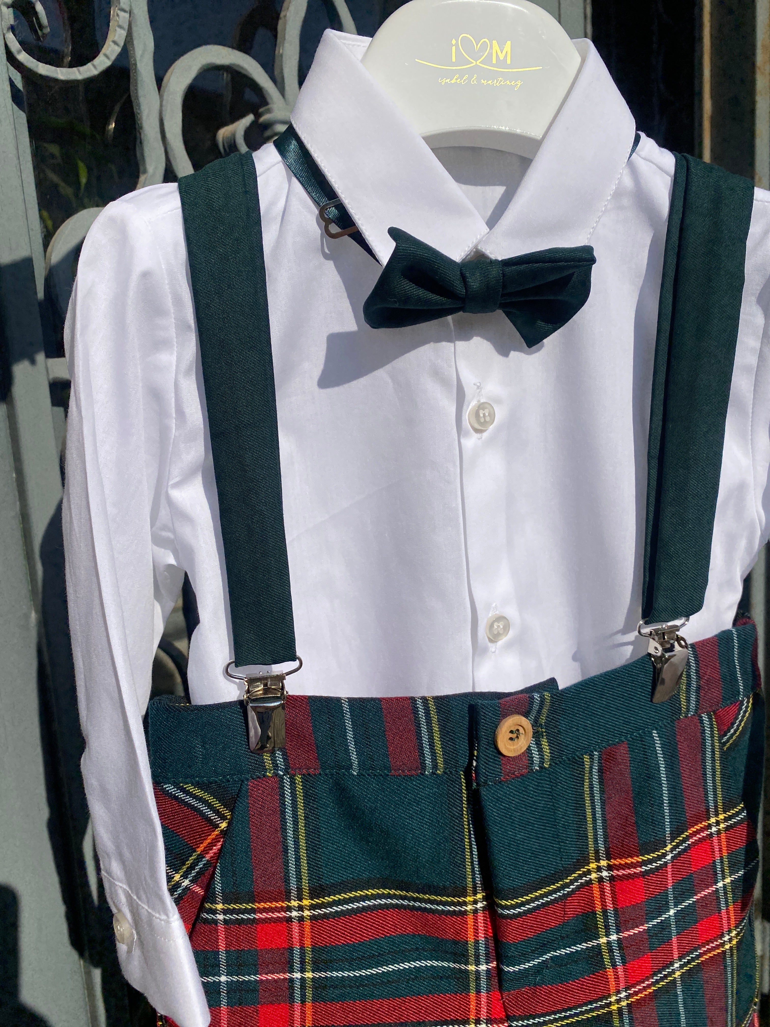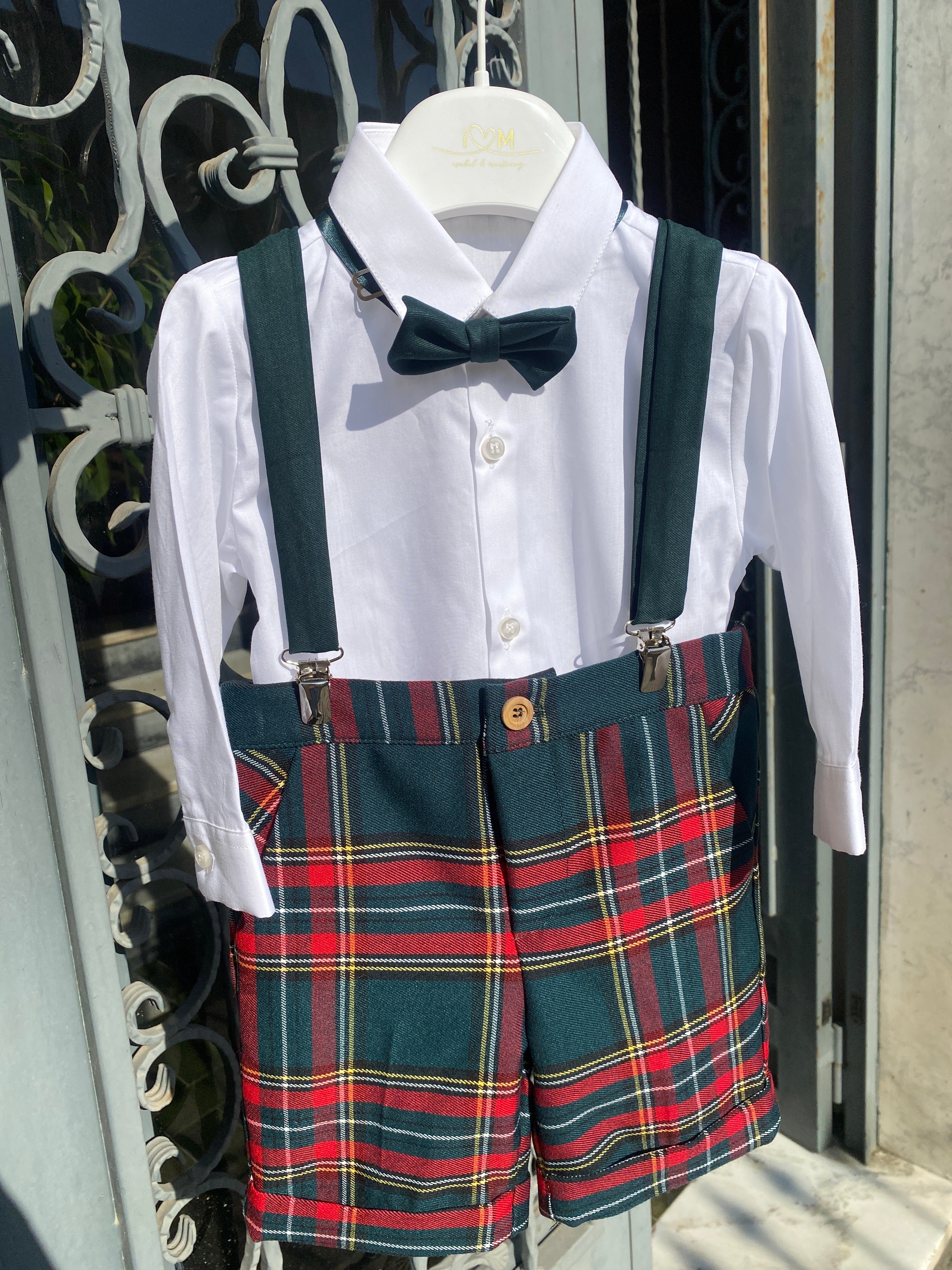 Completo natalizio raffinato per il vostro piccolo, realizzato con bermuda in tartan scozzese che cattura l'eleganza tradizionale delle festività. La camicia in cotone bianco puro garantisce comfort e traspirabilità, mentre papillon e bretelle coordinate completano un look sofisticato e versatile. Perfetto per occasioni speciali, fotografie di famiglia e celebrazioni natalizie, questo insieme unisce stile classico e praticità per i più piccoli.