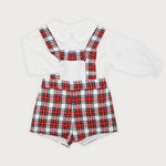 Questo completo neonato in caldo cotone unisce una salopette con fantasia scozzese a una camicia elegante dal collo tondo, progettato per offrire comfort e stile durante le festività natalizie. La scelta di materiali caldi garantisce morbidezza e protezione dal freddo, mentre il design raffinato lo rende perfetto per occasioni speciali, assicurando un look impeccabile e una vestibilità comoda per i più piccoli.