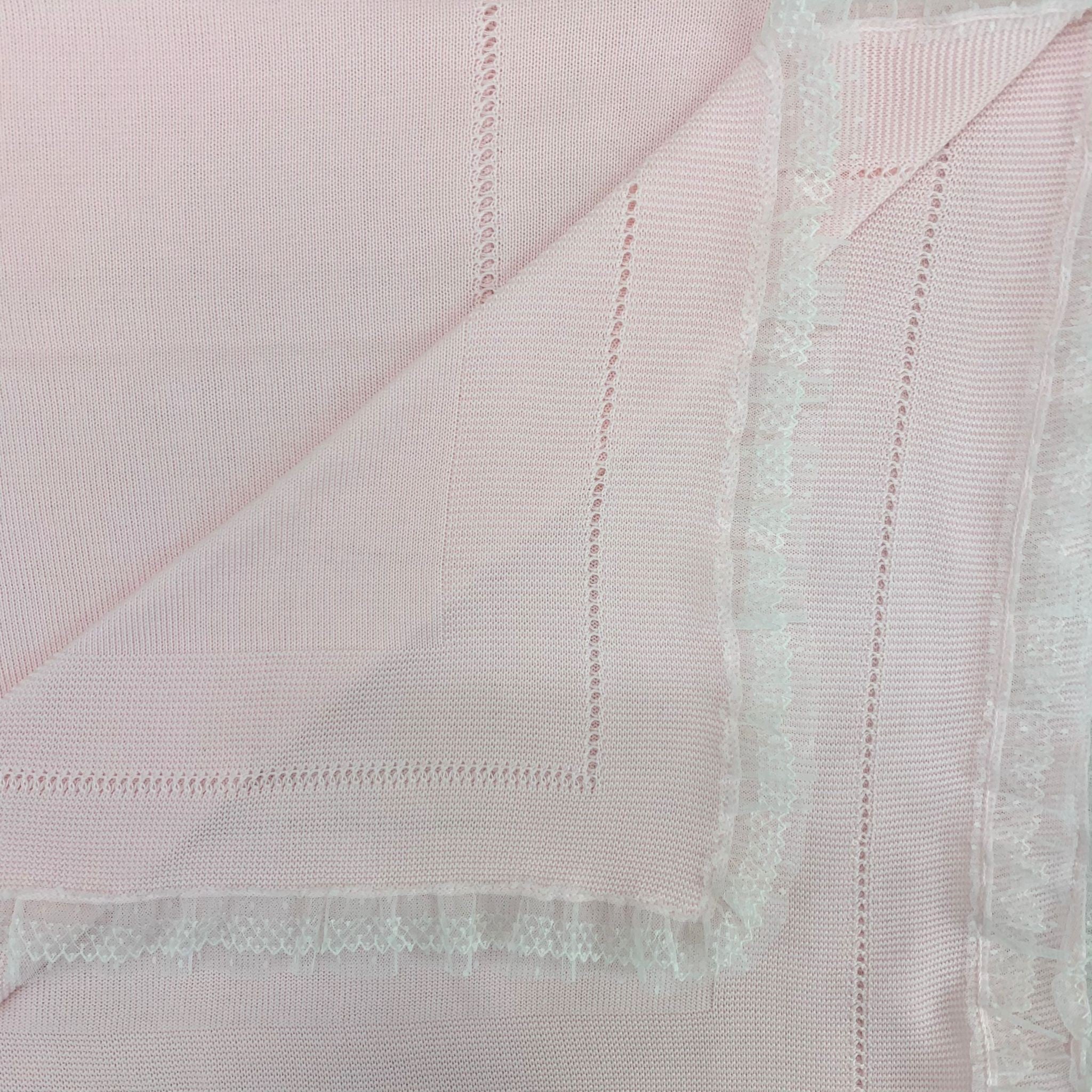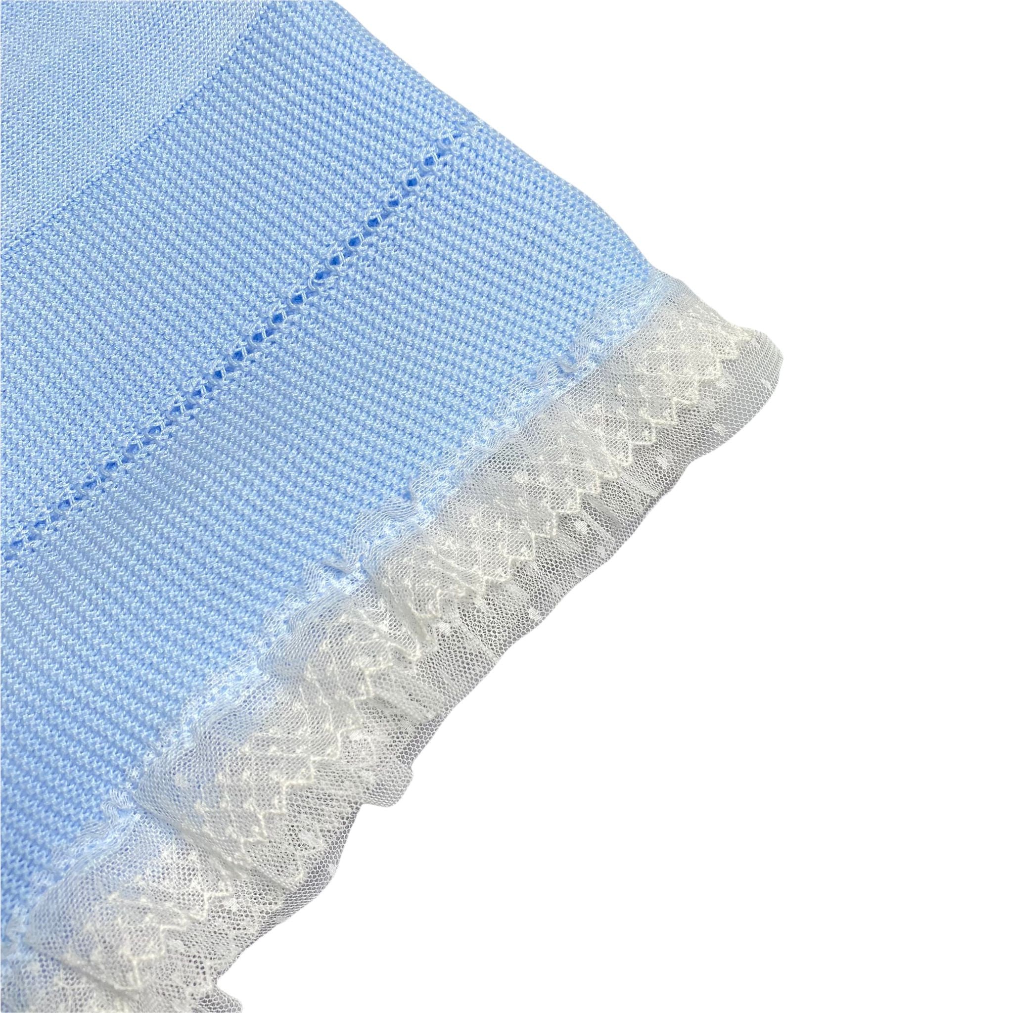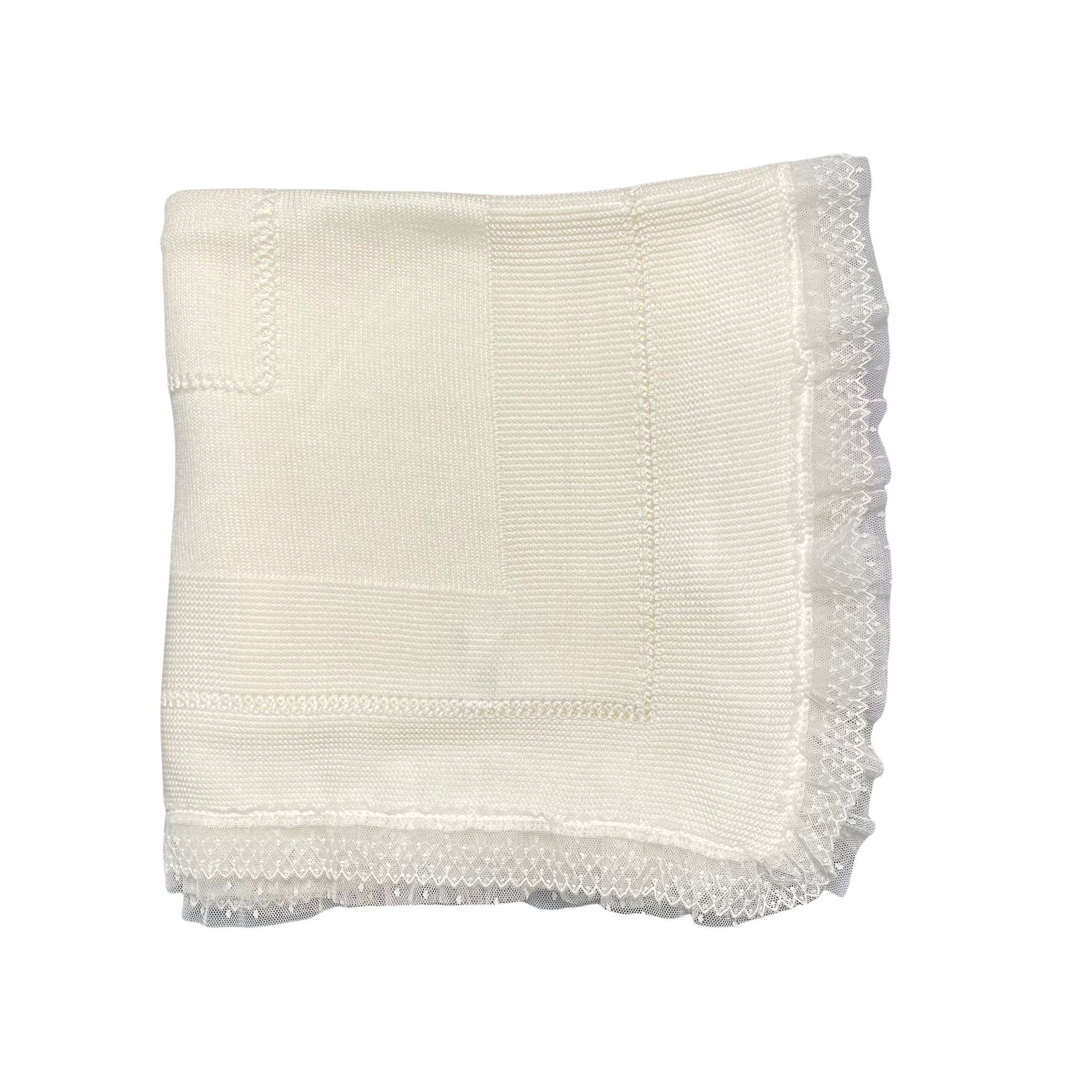 Coperta corredino in filo di cotone con bordatura in tulle a pois.