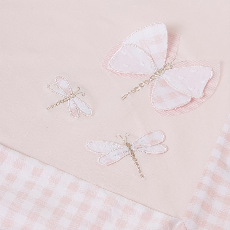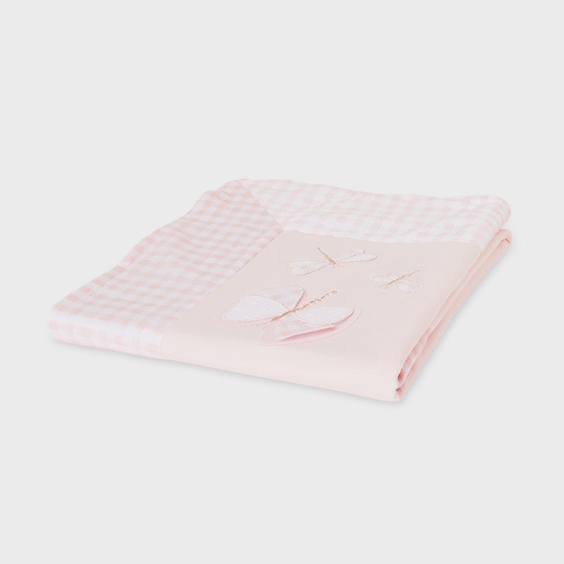 Coperta in cotone rosa con bordatura a quadretti, libellule ricamate nell'angolo.
