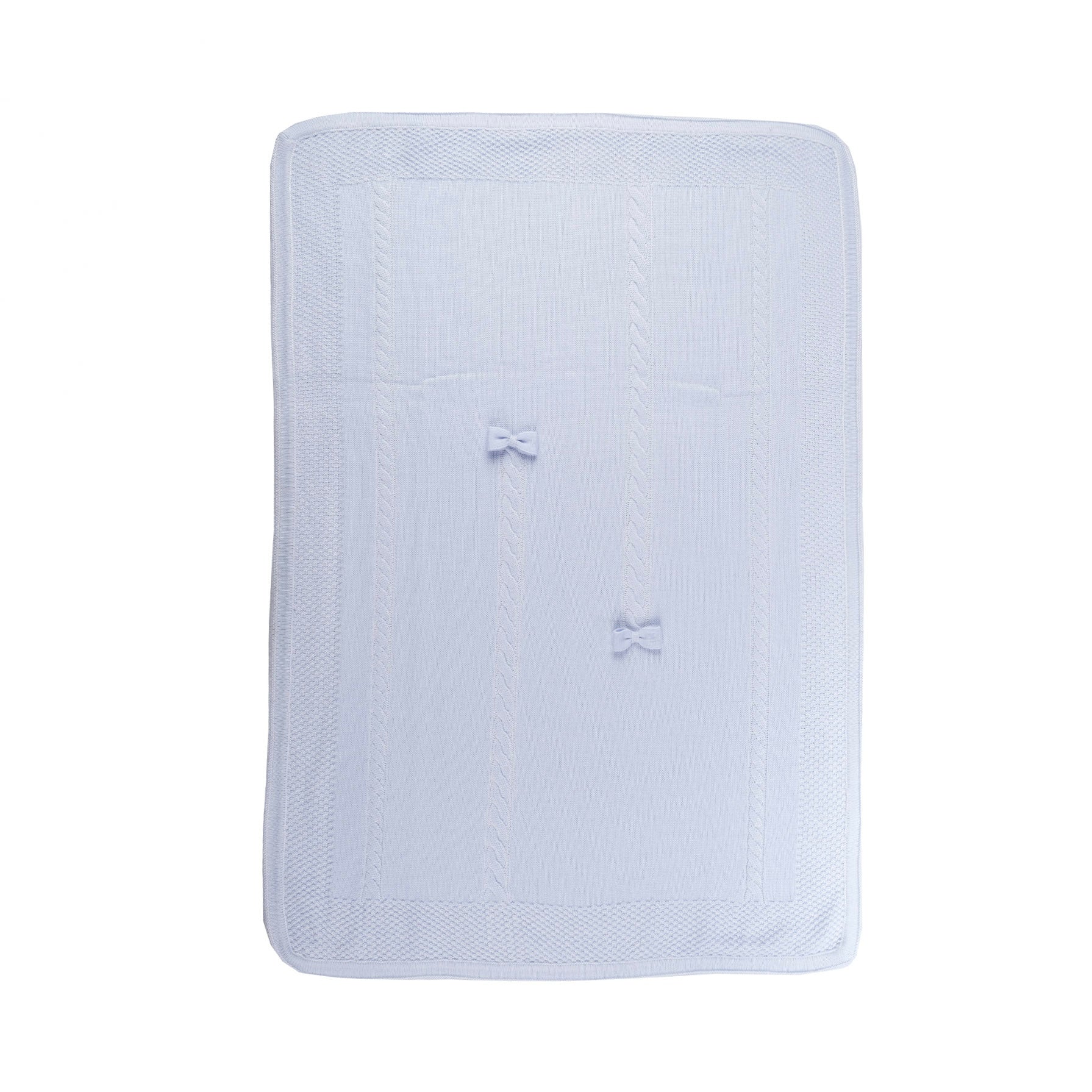 Copertina in lana 100%, in tinta unita celeste, con applicazione di trecce e fiocchi.