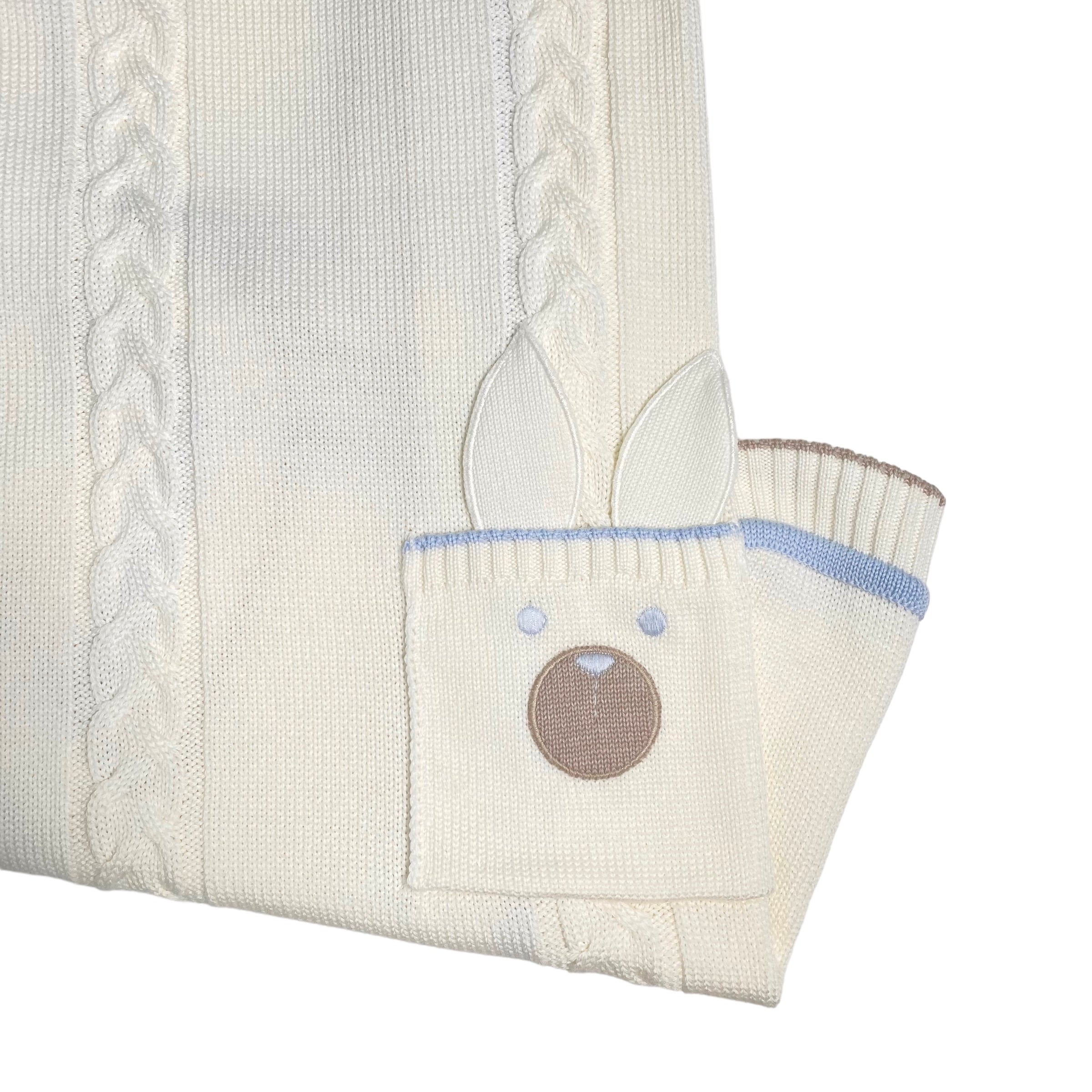 Coperta in pura lana 100%, in tinta unita panna, con trecce e taschino a forma di coniglietto.
