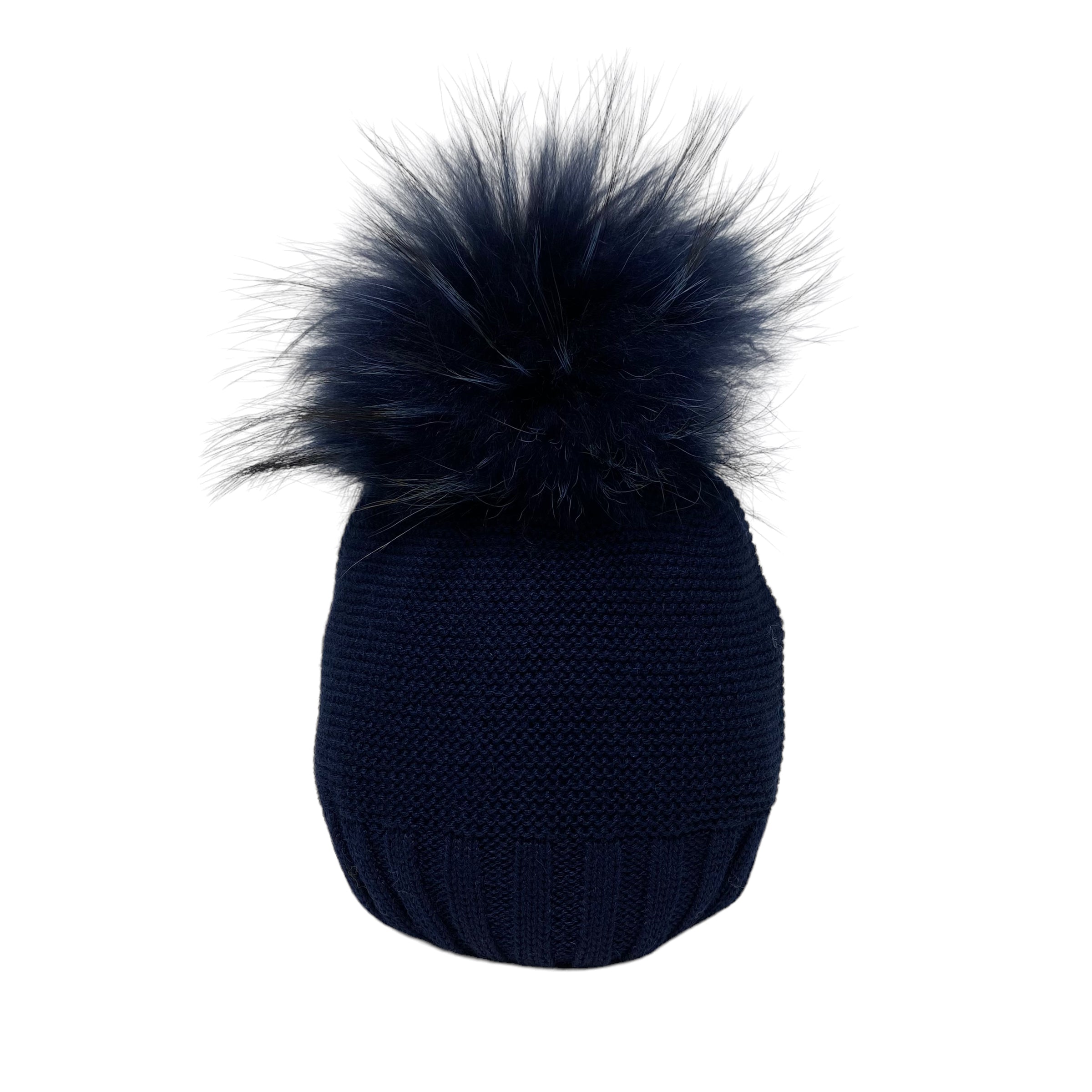 Cappello in misto lana liscio con pom pon in pelliccia originale.