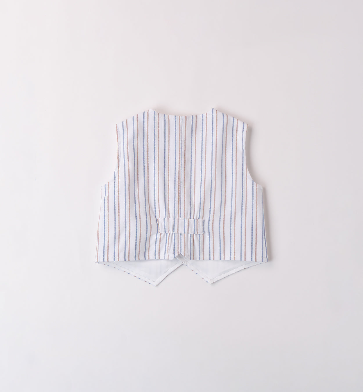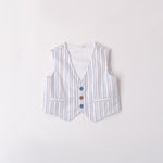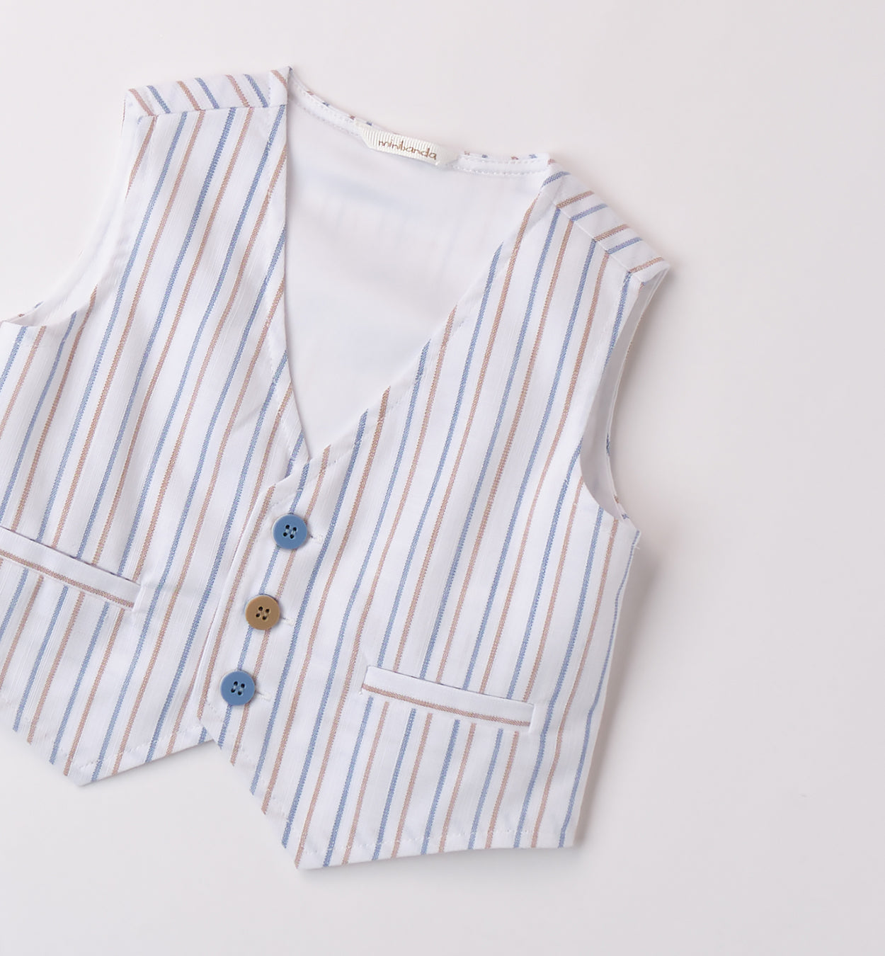 Gilet per bimbo Minibanda in tessuto stretch. Il modello presenta apertura frontale con bottoni e finte tasche laterali a filetto. La fodera è in satin stretch. Ideale per essere indossato durante le cerimonie estive del tuo bimbo!