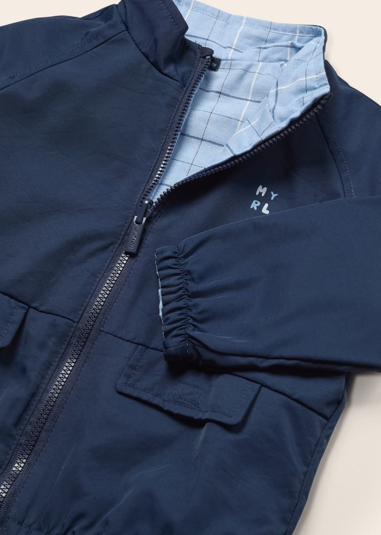 Giacca a vento manica lunga per bebé. Colletto avvolgente. Chiusura centrale con cerniera. Tasche funzionali nella parte anteriore. Modello con design reversibile.