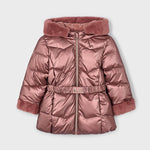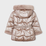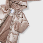 Giaccone manica lunga per bambina. Cappuccio con dettagli in pellicciotto. Chiusura centrale con cerniera. Morbida fodera interna in poliestere. Rifiniture metallizzate.