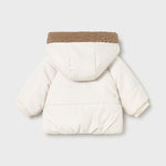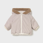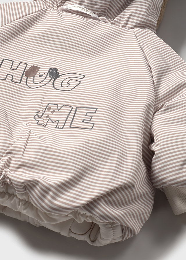 Giaccone manica lunga per neonato. Cappuccio con dettagli in pellicciotto. Chiusura centrale con cerniera. Esterno in tessuto con effetto imbottito. Morbida fodera interna in poliestere. Elementi decorativi: Serigrafia (print). Modello con design reversibile.