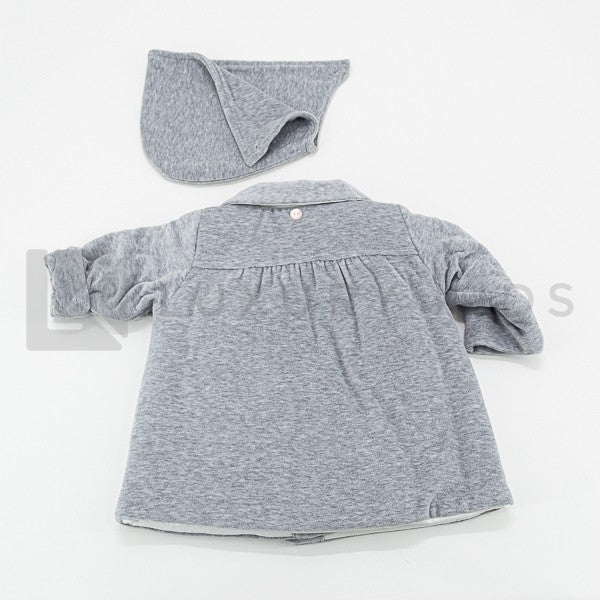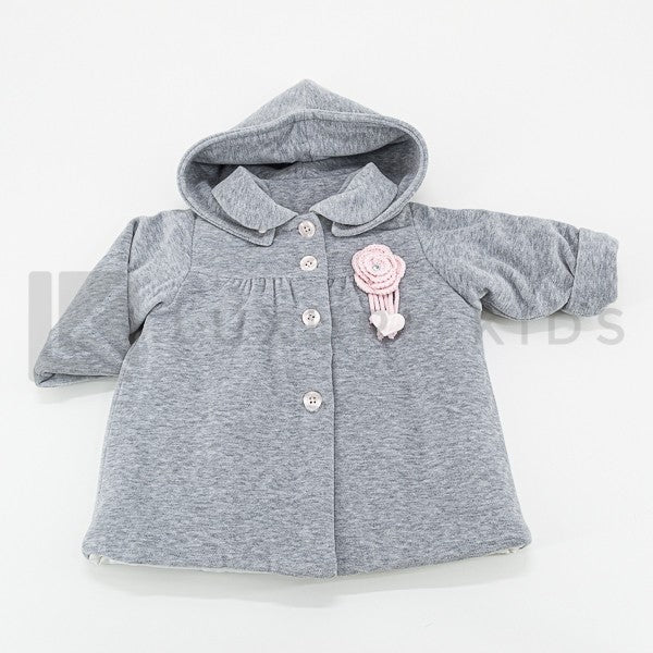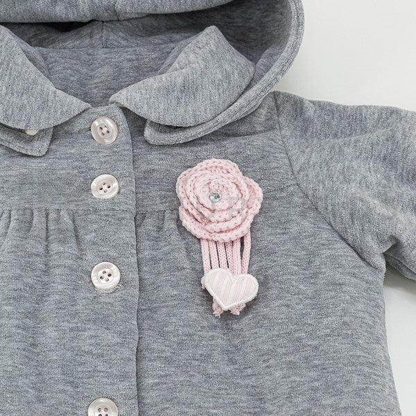 Giubbottino svasato in morbida ciniglia con cappuccio removibile grigio con applicazione rosa sul petto.