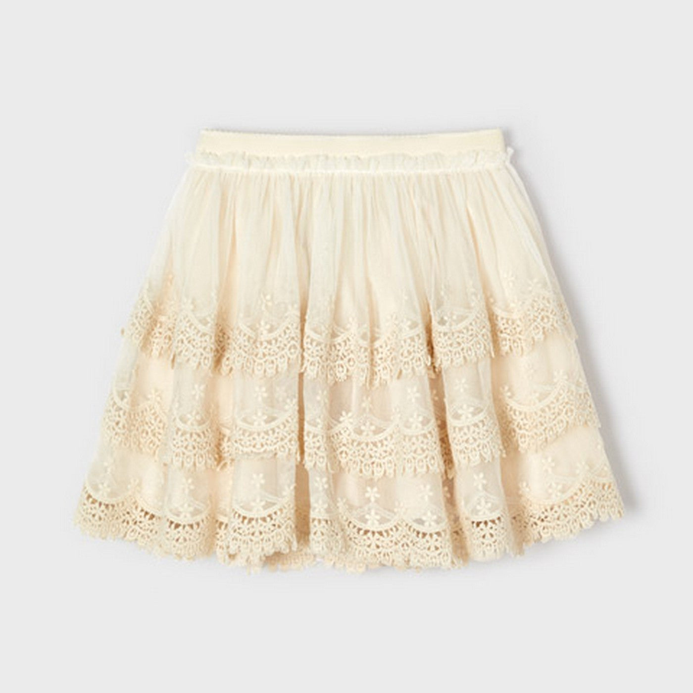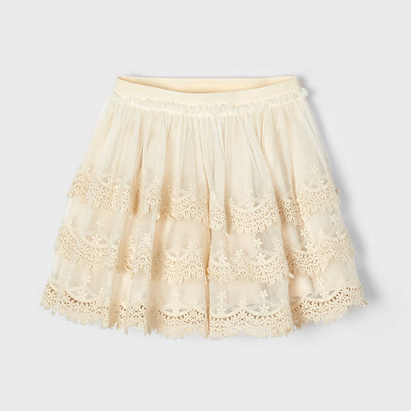 Gonna In cotone beige con elastico in vita e tulle ricamato.