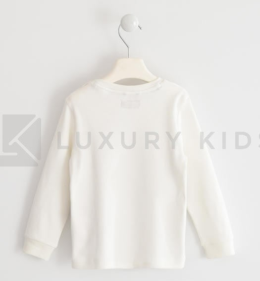 Maglietta girocollo Sarabanda in interlock 100% cotone con due simpatiche stampe. Scegli quella più divertente per il tuo bambino!
