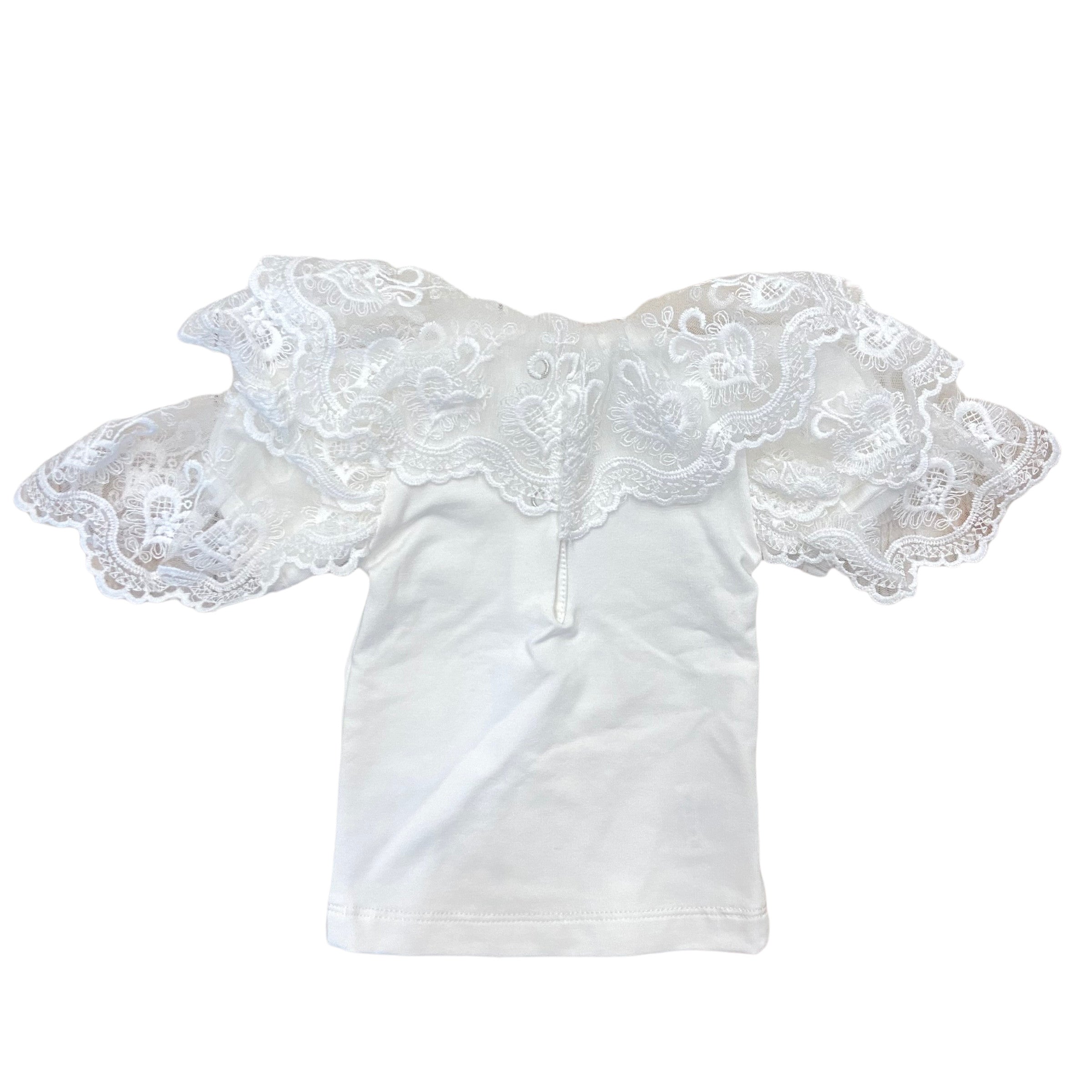 Maglietta manica corta in cotone con una bellissima ruches in pizzo con dei ricami in rilievo bianco.