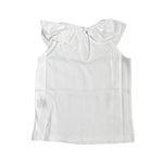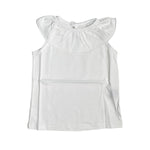 Maglietta smanicata bianca con una bellissima ruches sul colletto. Apertura sul retro del colletto con un bottoncino.