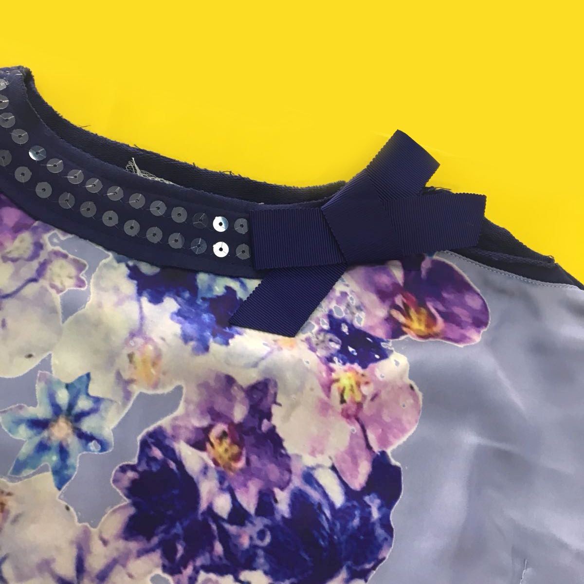 Maglioncino in caldo cotone mezza manica blu cobalto con stampa fiori sul davanti e fiocco con paillettes applicate sul collo