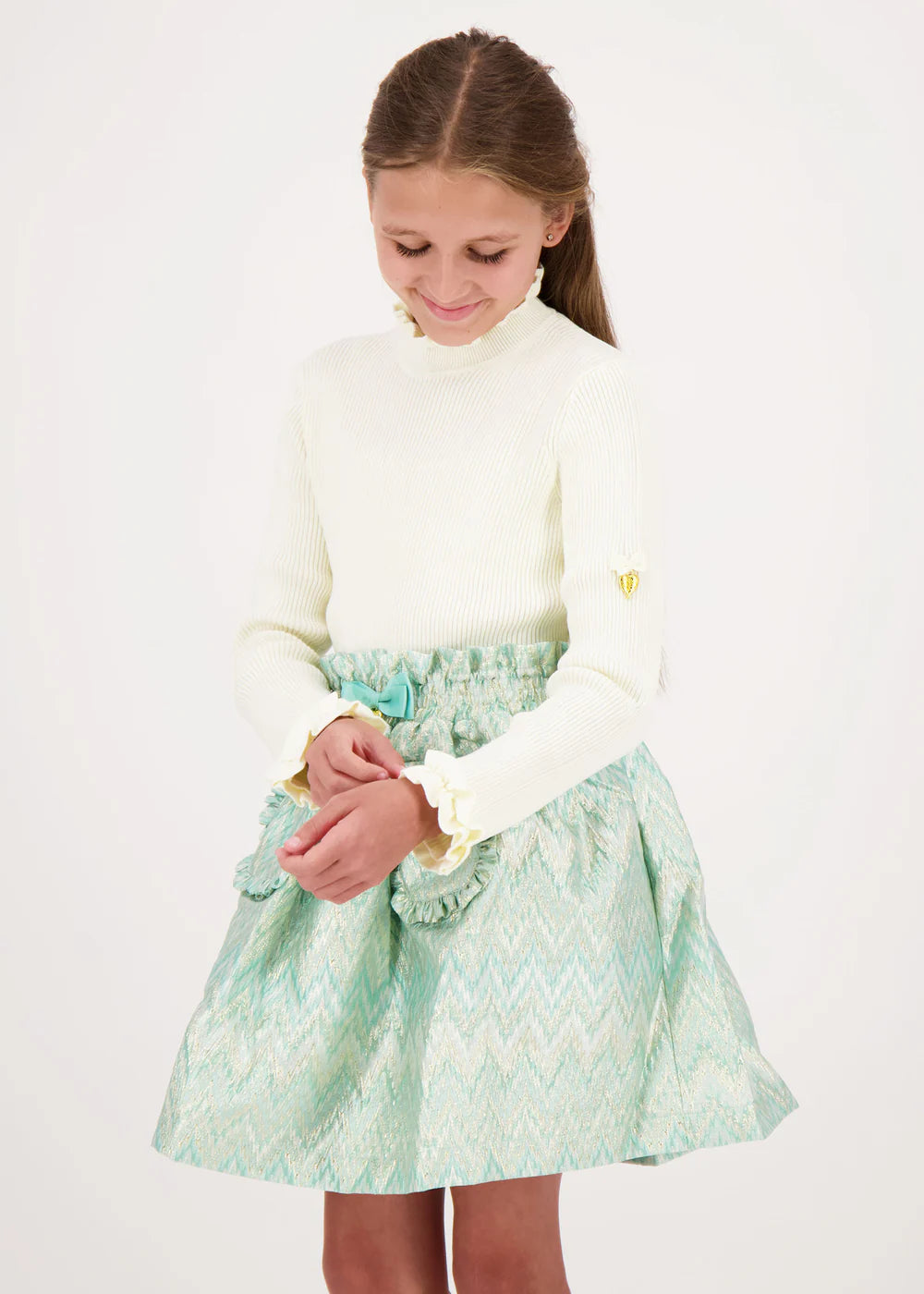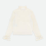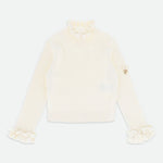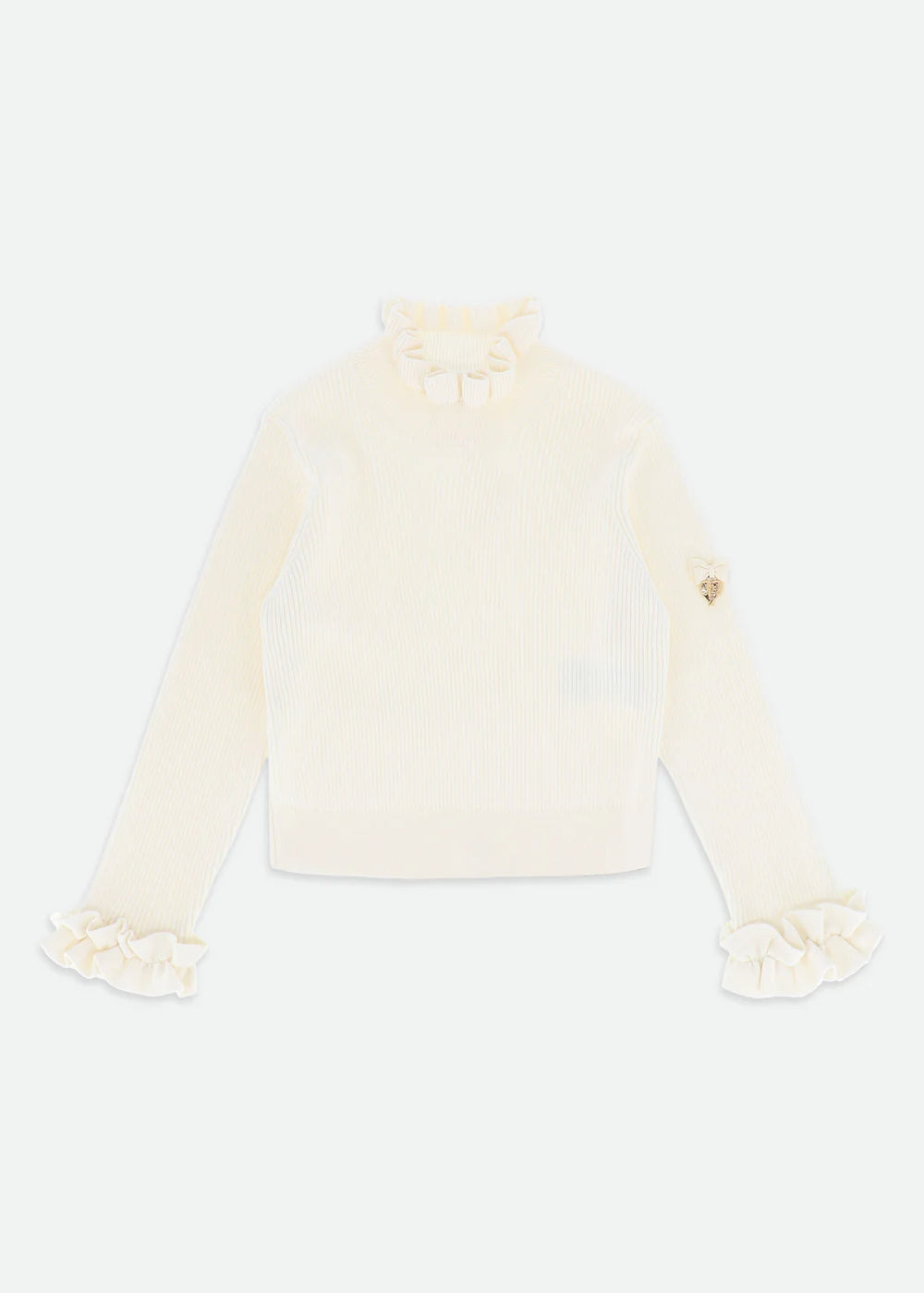 Maglione color vaniglia a coste graziose con dettagli volant. Realizzato in morbidissima maglia di cotone, questo maglione è rifinito con una balza sul collo e sui polsini. Presenta il nostro caratteristico fiocco e il ciondolo a cuore dorato sulla manica.