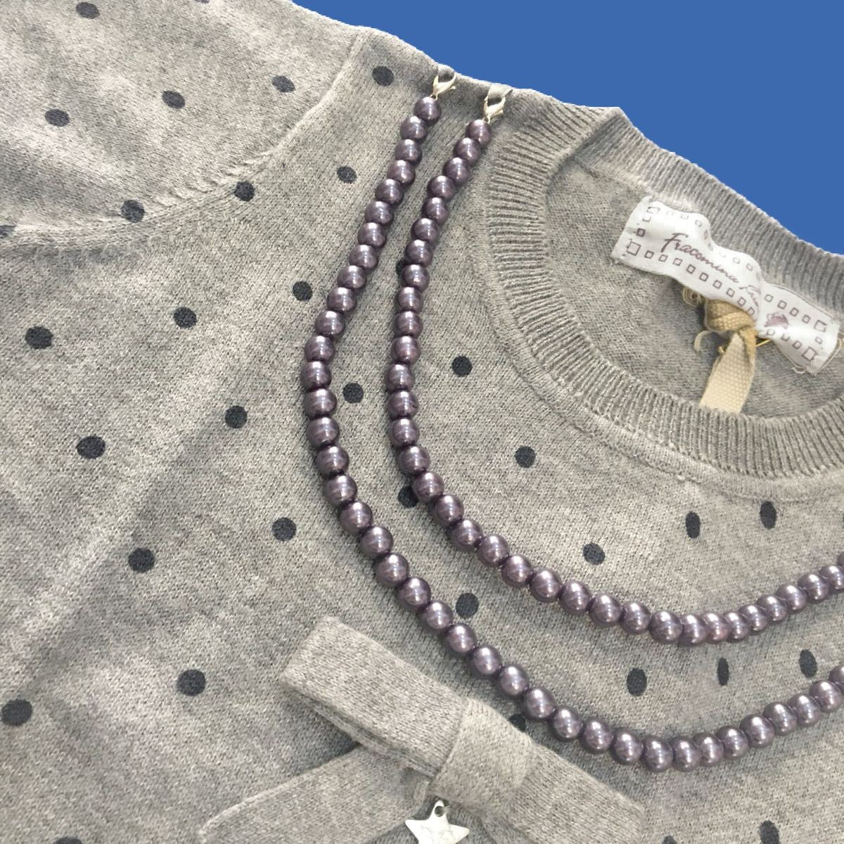 Maglioncino mezza manica in caldo cotone grigio con pois blu e collane di perline viola rimovibili sul davanti