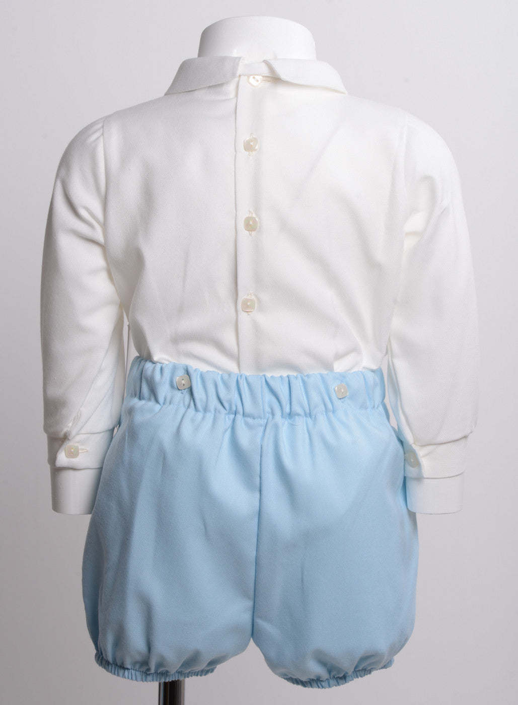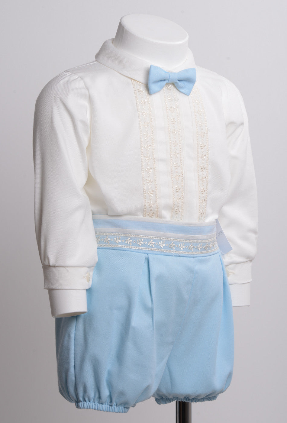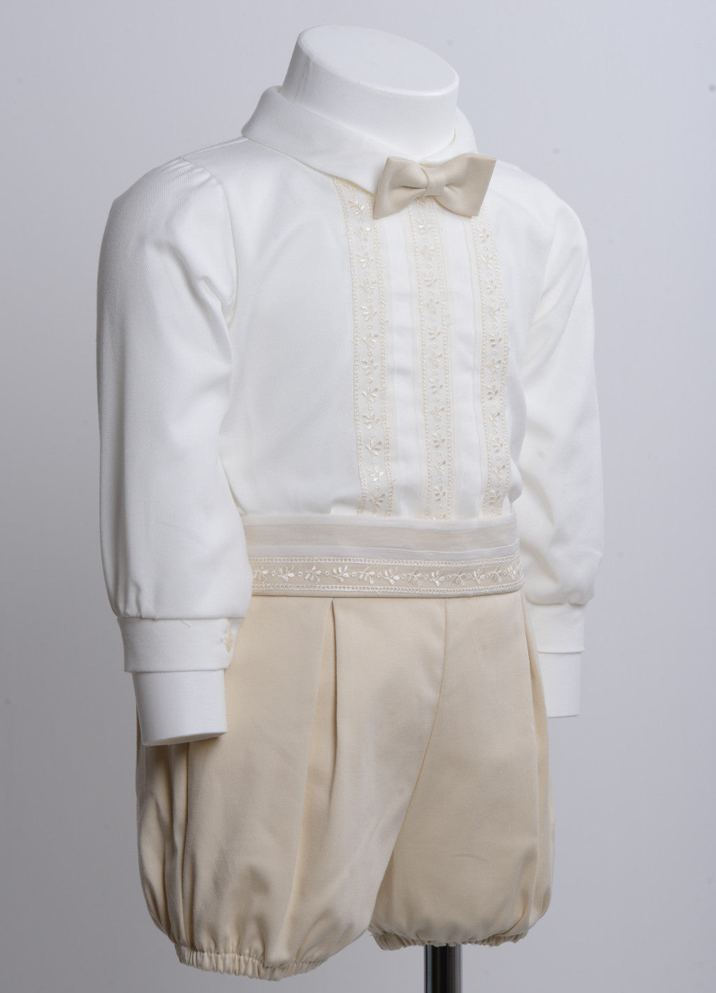 Completo due pezzi composto da bermuda con elastico in vita e alle gambe e fascia, camicia con bottoni sul retro e con fascia al centro e papillon.