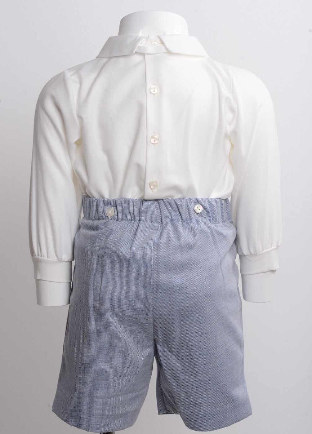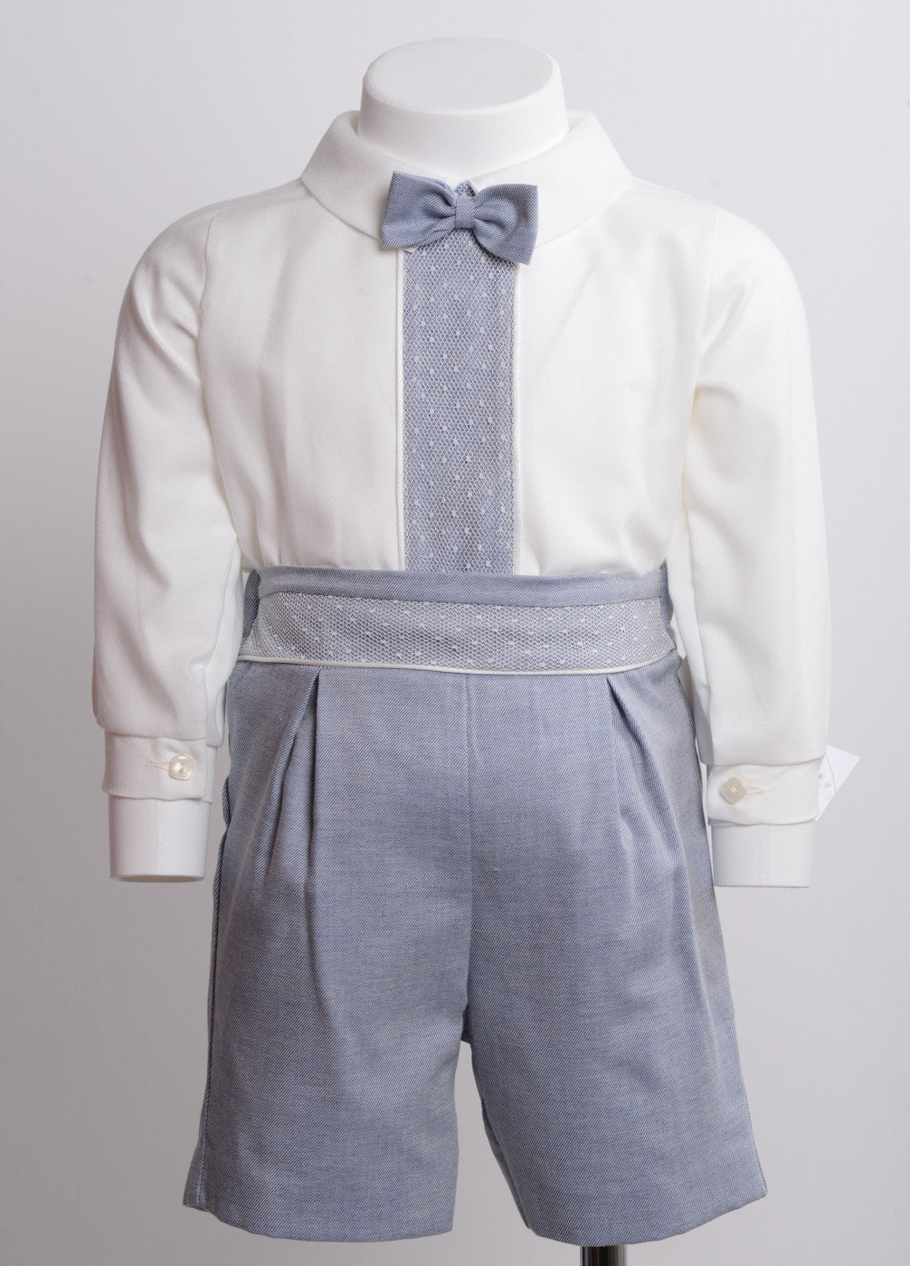 Completo composto da bermuda con fascia in pizzo a pois e camicia con fascia centrale e papillon, chiusura con bottoni sul retro e colletto girocollo.