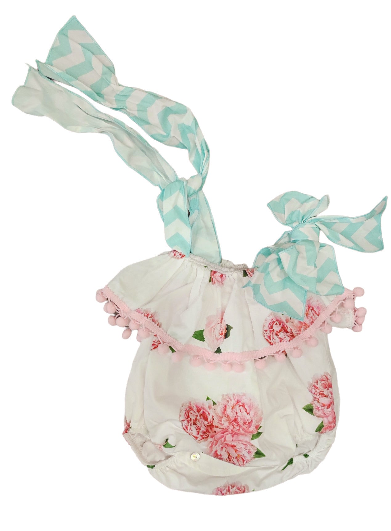 Pagliaccetto in cotone per lei bianco con fantasia floreale con dettaglio delle bretelle che si chiudono con un bellissimo fiocco con fantasia a righe celeste e biasnco.