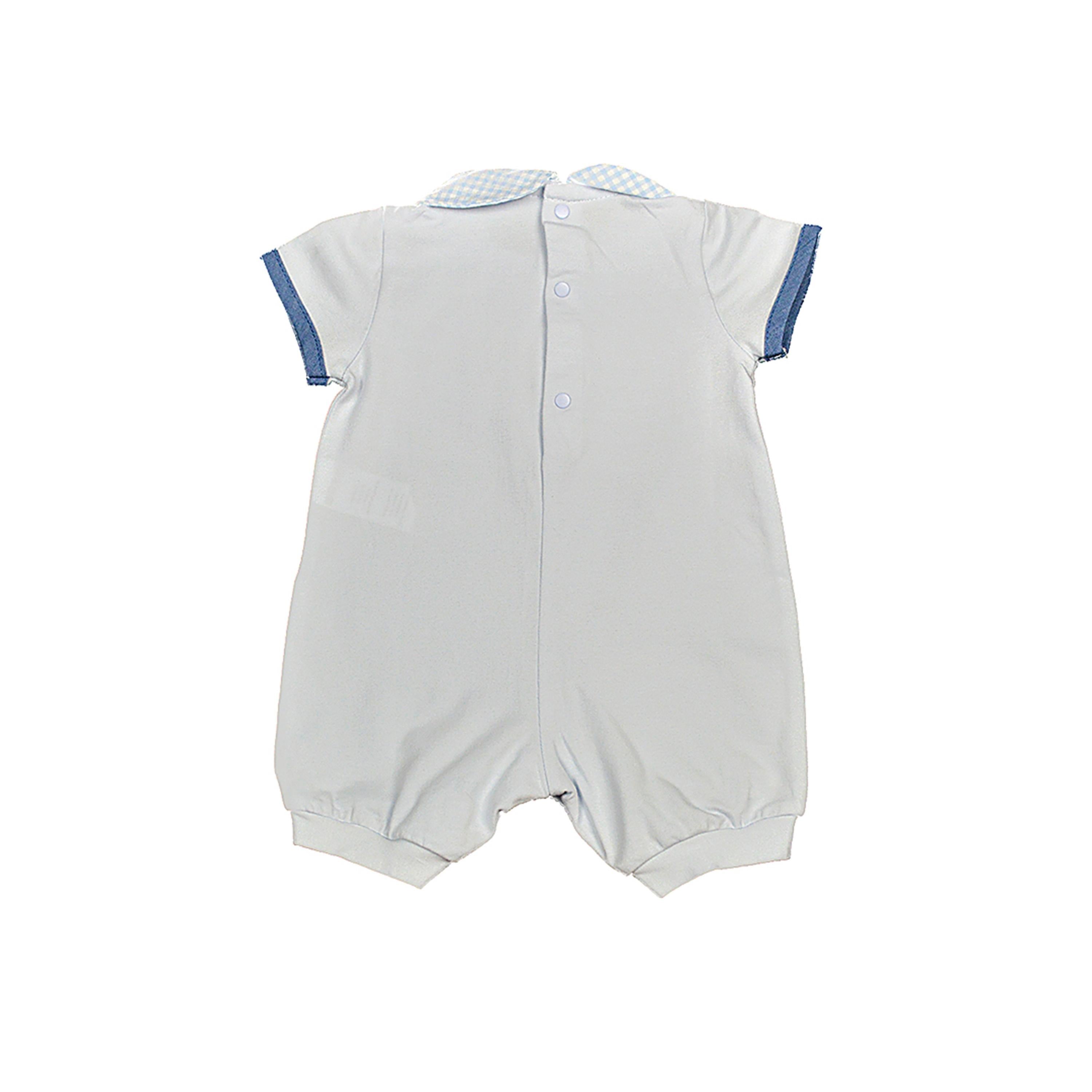 Pagliaccetto a tinta unita con colletto a quadretti e ricamo sul petto.